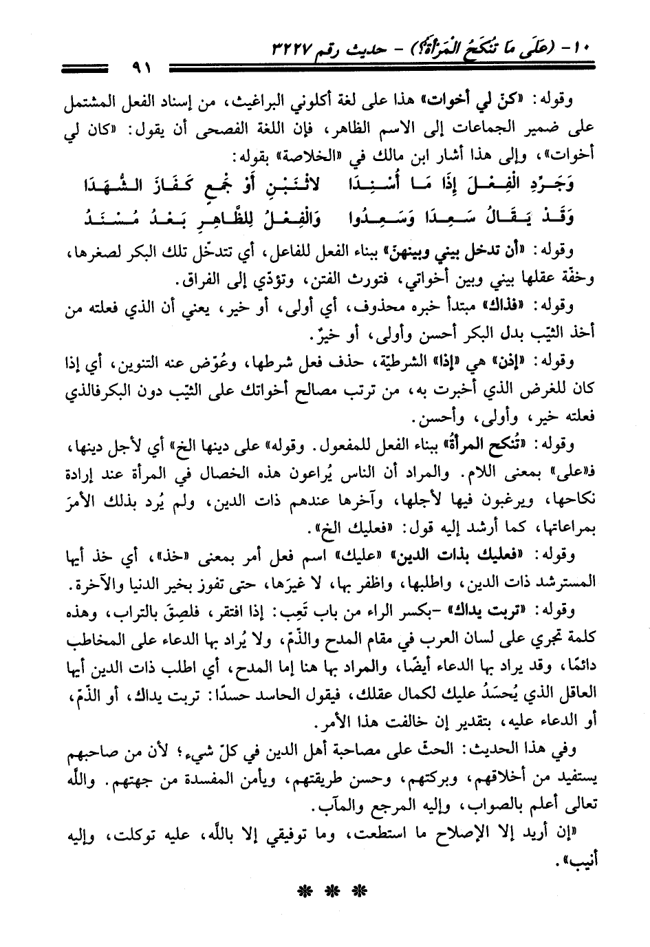 وقوله: "فعليك بذات الدين" "عليك" اسم فعل أمر بمعنى "خذ"، أي خذ أيها المسترشد ذات الدين، واطلبها، واظفر بها، لا غيرَها، حتى تفوز بخير الدنيا والآخرة. وقوله: "تربت يداك" -بكسر الراء من باب تَعِب: إذا افتقر، فلصِقَ بالتراب، وهذه كلمة تجري على لسان العرب في مقام المدح والذّمّ، ولا يُراد بها الدعاء على المخاطب دائمًا، وقد يراد بها الدعاء أيضًا، والمراد بها هنا إما المدح، أي اطلب ذات الدين أيها العاقل الذي يُحسَدُ عليك لكمال عقلك، فيقول الحاسد حسدًا: تربت يداك، أو الذّمّ، أو الدعاء عليه، بتقدير إن خالفت هذا الأمر.