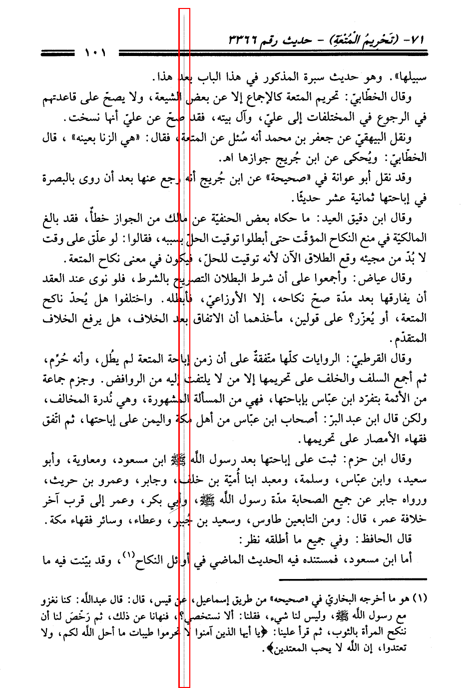(¬1) هو ما أخرجه البخاريّ في "صحيحه" من طريق إسماعيل، عن قيس، قال: قال عبد اللَّه: كنا نغزو مع رسول اللَّه - صلى اللَّه عليه وسلم -، وليس لنا شيء، فقلنا: ألا نستخصي؟، فنهانا عن ذلك، ثم رَخّصَ لنا أن ننكح المرأة بالثوب، ثم قرأ علينا: {يَا أَيُّهَا الَّذِينَ آمَنُوا لَا تُحَرِّمُوا طَيِّبَاتِ مَا أَحَلَّ اللَّهُ لَكُمْ وَلَا تَعْتَدُوا إِنَّ اللَّهَ لَا يُحِبُّ الْمُعْتَدِينَ}.