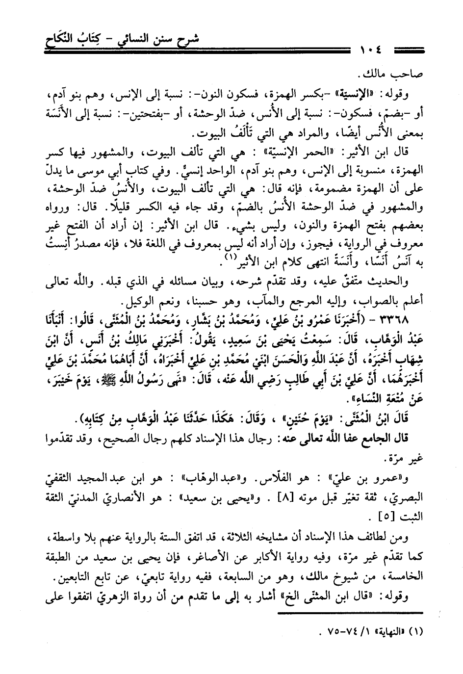 3368 - (أَخْبَرَنَا عَمْرُو بْنُ عَلِيٍّ, وَمُحَمَّدُ بْنُ بَشَّارٍ, وَمُحَمَّدُ بْنُ الْمُثَنَّى, قَالُوا: أَنْبَأَنَا عَبْدُ الْوَهَّابِ, قَالَ: سَمِعْتُ يَحْيَى بْنَ سَعِيدٍ, يَقُولُ أَخْبَرَنِي مَالِكُ بْنُ أَنَسٍ, أَنَّ ابْنَ شِهَابٍ أَخْبَرَهُ, أَنَّ عَبْدَ اللَّهِ وَالْحَسَنَ ابْنَىْ مُحَمَّدِ بْنِ عَلِيٍّ أَخْبَرَاهُ, أَنَّ أَبَاهُمَا مُحَمَّدَ بْنَ عَلِيٍّ أَخْبَرَهُمَا, أَنَّ عَلِىَّ بْنَ أَبِي طَالِبٍ - رضي اللَّه عنه -, قَالَ: "نَهَى رَسُولُ اللهِ - صلى اللَّه عليه وسلم - يَوْمَ خَيْبَرَ, عَنْ مُتْعَةِ النِّسَاءِ".