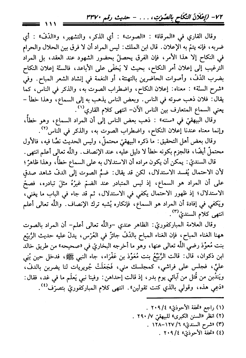 وقال القاري في "المرقاة": "الصوت": أي الذكر، والتشهير، و"الدّفّ": أي ضربه، فإنه يتمّ به الإعلان. قال ابن الملك: ليس المراد أن لا فرق بين الحلال والحرام في النكاح إلا هذا الأمر، فإن الفرق يحصلُ بحضور الشهود عند العقد، بل المراد الترغيب إلى إعلان أمر النكاح، بحيث لا يَخفَى على الأباعد، فالسنّة إعلان النكاح بضرب الدّفّ، وأصوات الحاضرين بالتهنئة، أو النغمة في إنشاد الشعر المباح. وفي "شرح السنّة": معناه: إعلان النكاح، واضطراب الصوت به، والذكر في الناس، كما يقال: فلان ذهب صوته في الناس. وبعض الناس يذهب به إلى السماع، وهذا خطأ - يعني السماع المتعارف بين الناس الآن- انتهى كلام القاري (¬1).