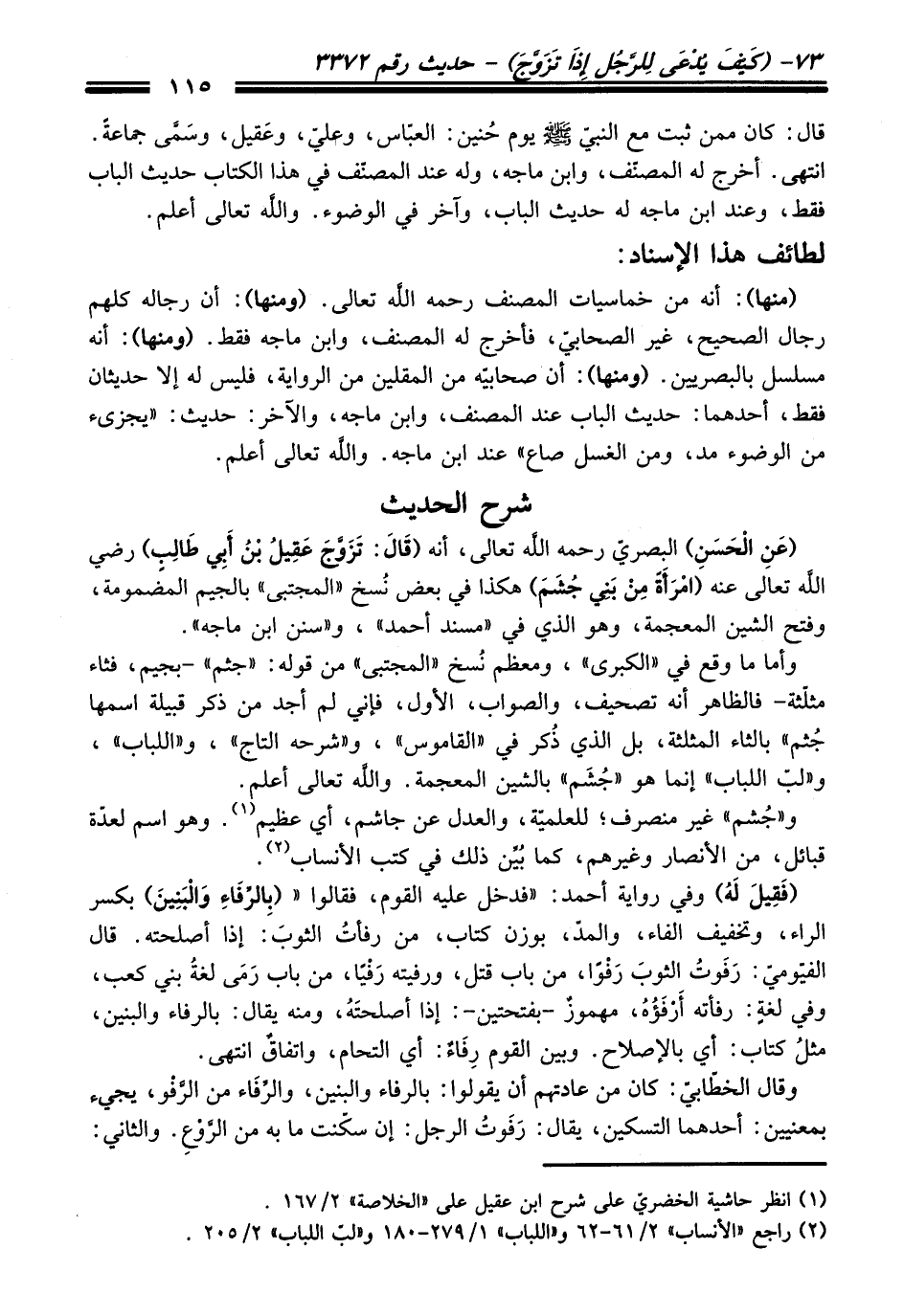 (عَنِ الْحَسَنِ) البصريّ -رحمه اللَّه تعالى-، أنه (قالَ: تَزَوَّجَ عَقِيلُ بْنُ أَبِي طَالِبٍ) - رضي اللَّه تعالى عنه - (امْرَأَةً مِنْ بَنِي جُشَمَ) هكذا في بعض نُسخ "المجتبى" بالجيم المضَمومة، وفتح الشين المعجمة، وهو الذي في "مسند أحمد"، و"سنن ابن ماجه".