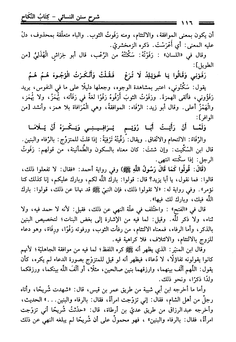 قال في "الفتح": واختُلف في علّة النهي عن ذلك، فقيل: لأنه لا حمد فيه، ولا ثناء، ولا ذكر للَّه. وقيل: لما فيه من الإشارة إلى بغض البنات؛ لتخصيص البنين بالذكر، وأما الرفاء، فمعناه الالتئام، من رفأت الثوب، ورفوته رَفوًا، ورِفَاءً، وهو دعاء للزوج بالالتئام، والائتلاف، فلا كراهية فيه.