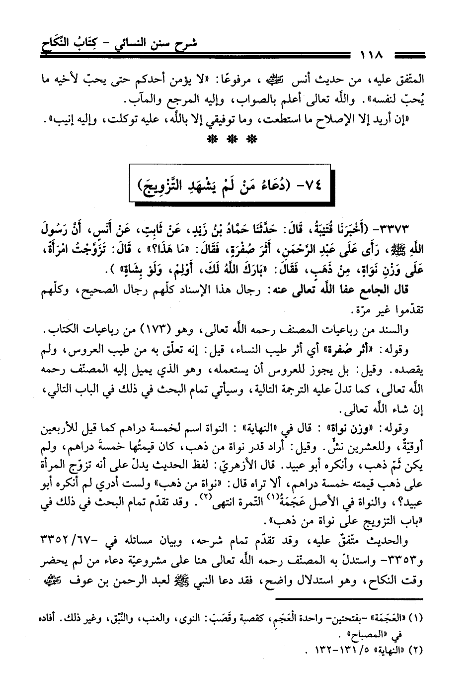 3373 - (أَخْبَرَنَا قُتَيْبَةُ, قَالَ: حَدَّثَنَا حَمَّادُ بْنُ زَيْدٍ, عَنْ ثَابِتٍ, عَنْ أَنَسٍ, أَنَّ رَسُولَ اللهِ - صلى اللَّه عليه وسلم -, رَأَى عَلَى عَبْدِ الرَّحْمَنِ, أَثَرَ صُفْرَةٍ, فَقَالَ: «مَا هَذَا؟». قَالَ: تَزَوَّجْتُ امْرَأَةً, عَلَى وَزْنِ نَوَاةٍ, مِنْ ذَهَبٍ, فَقَالَ: «بَارَكَ اللَّهُ لَكَ, أَوْلِمْ, وَلَوْ بِشَاةٍ»).