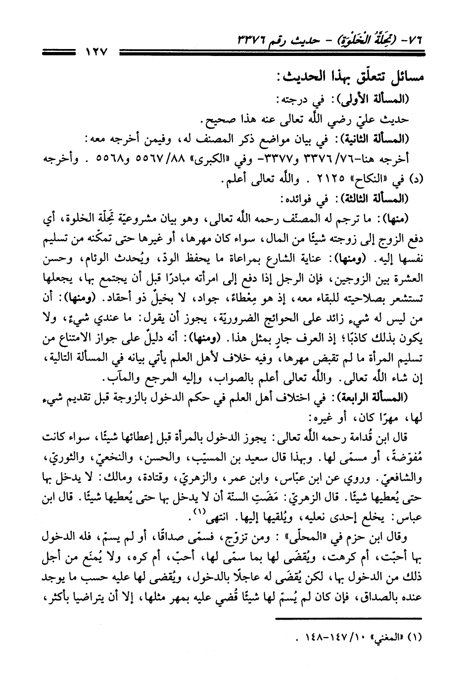 (المسألة الرابعة): في اختلاف أهل العلم في حكم الدخول بالزوجة قبل تقديم شيء لها، مهرًا كان، أو غيره: