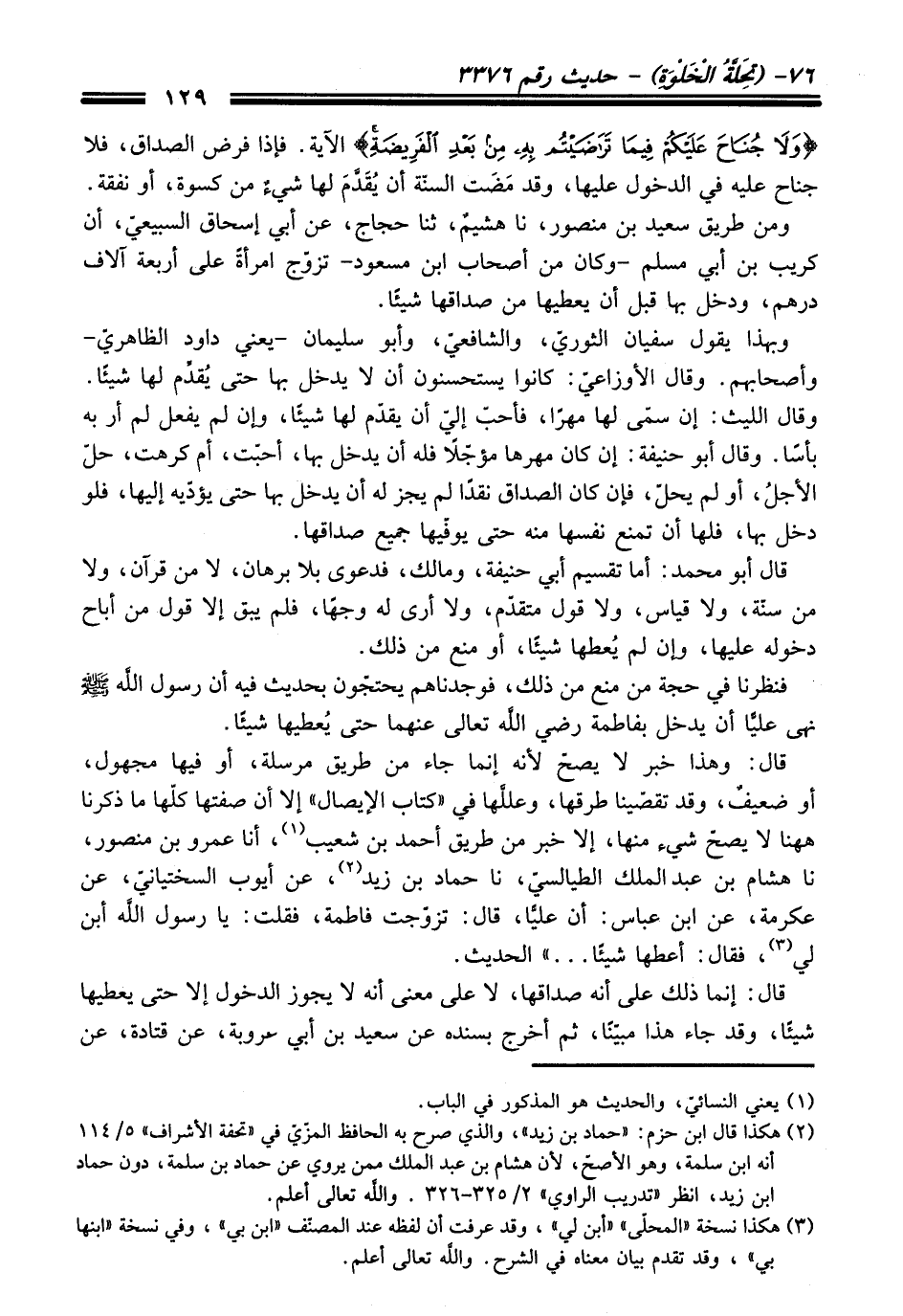 فنظرنا في حجة من منع من ذلك، فوجدناهم يحتجّون بحديث فيه أن رسول اللَّه - صلى الله عليه وسلم - نهى عليًّا أن يدخل بفاطمة - رضي اللَّه تعالى عنهما - حتى يُعطيها شيئًا.