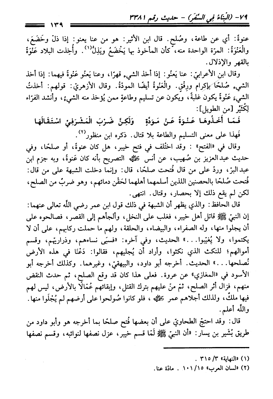 وقال في "الفتح": وقد اختُلف في فتح خيبر، هل كان عنوةً، أو صلحًا، وفي حديث عبد العزيز بن صُهيب، عن أنس - رضي اللَّه عنه - التصريح بأنه كان عَنوةً، وبه جزم ابن عبد البرّ، وردّ على من قال فُتحت صلحًا، قال: وإنما دخلت الشبهة على من قال: فُتحت صُلحًا بالحصنين اللذين أسلمهما أهلهما لحَقْن دمائهم، وهو ضربٌ من الصلح، لكن لم يقع ذلك إلا بحصار، وقتال. انتهى.
