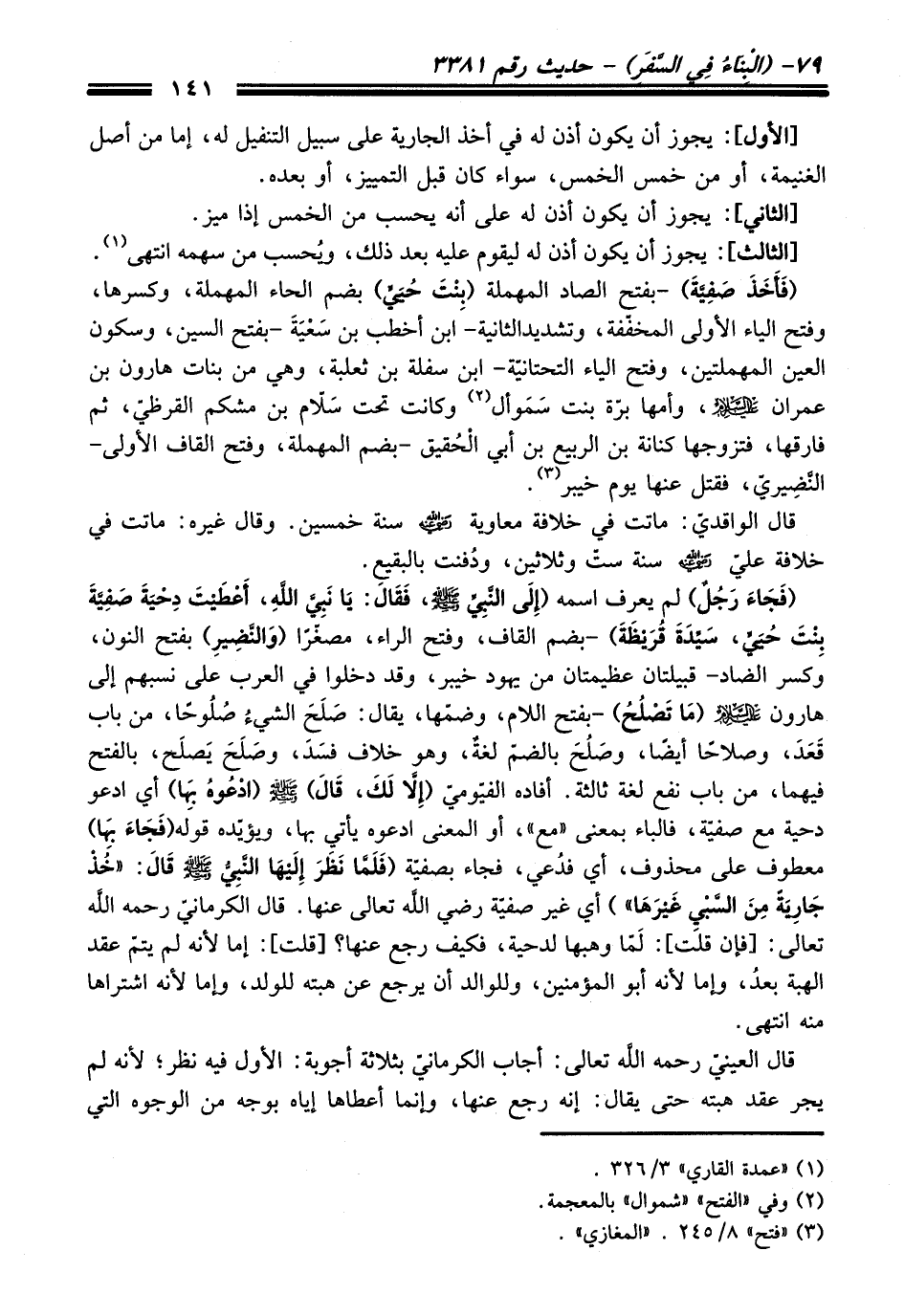 قال الواقديّ: ماتت في خلافة معاوية - رضي اللَّه عنه - سنة خمسين. وقال غيره: ماتت في خلافة عليّ - رضي اللَّه عنه - سنة ستّ وثلاثين، ودُفنت بالبقيع. (فَجَاءَ رَجُلٌ) لم يعرف اسمه (إِلَى النبيّ - صلى اللَّه عليه وسلم -، فَقالَ: يَا نَبِي اللَّهِ، أَعْطَيْتَ دِحْيَةَ صَفِيَّةَ بِنْتَ حُيَيِّ، سَيِّدَةَ قُرَيْظَةَ) -بضم القاف، وفتح الراء، مصغّرًا (والنَّضِيرِ) بفتح النون، وكسر الضاد- قبيلتان عظيمتان من يهود خيبر، وقد دخلوا في العرب على نسبهم إلى هارون - عليه السلام - (ما تَصْلُحُ) -بفتح اللام، وضمّها، يقال: صَلَحَ الشيءُ صُلُوحًا، من باب قَعَدَ، وصلاحًا أيضًا، وصَلُحَ بالضمّ لغةٌ، وهو خلاف فسَدَ، وصَلَحَ يَصلَح، بالفتح فيهما، من باب نفع لغة ثالثة. أفاده الفيّوميّ (إِلَّا لَكَ، قَالَ) - صلى اللَّه عليه وسلم - (ادْعُوهُ بِهَا) أي ادعو دحية مع صفيّة، فالباء بمعنى "مع"، أو المعنى ادعوه يأتي بها، ويؤيّده قوله (فَجَاءَ بِهَا) معطوف على محذوف، أي فدُعي، فجاء بصفيّة (فَلَمَّا نَظَرَ إِلَيْهَا النَّبِيُّ - صلى اللَّه عليه وسلم - قالَ: "خُذْ جارَيةً مِنَ السَّبْي غَيْرَها") أي غير صفيّة - رضي اللَّه تعالى عنها -. قال الكرمانيّ -رَحِمَهُ اللَّهُ تَعَالَى-: [فإن قلت]: لَمّا وهبها لدحية، فكيف رجع عنها؟ [قلت]: إما لأنه لم يتمّ عقد الهبة بعدُ، وإما لأنه أبو المؤمنين، وللوالد أن يرجع عن هبته للولد، وإما لأنه اشتراها منه انتهى.