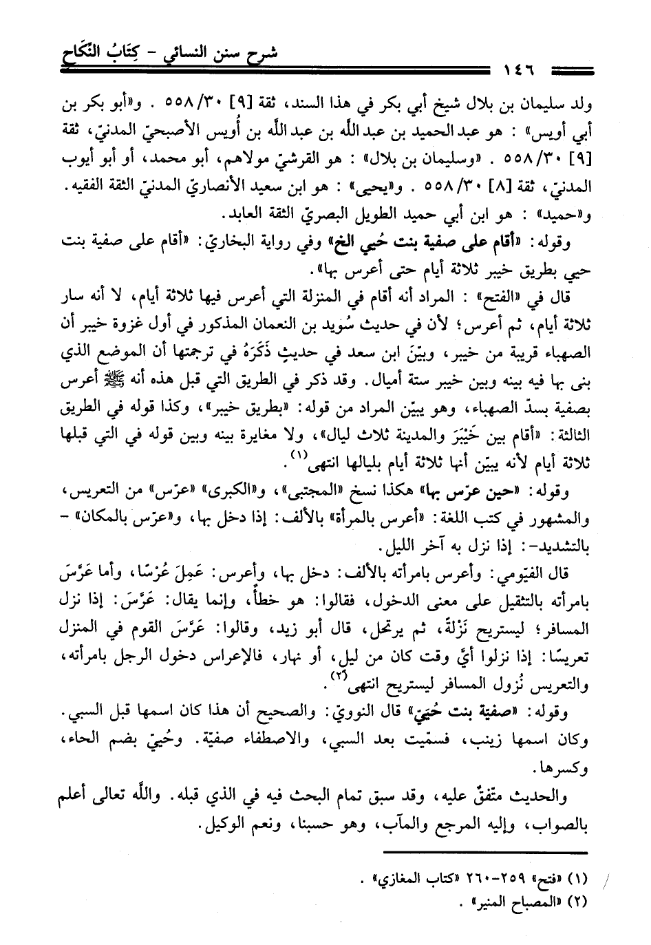 قال في "الفتح": المراد أنه أقام في المنزلة التي أعرس فيها ثلاثة أيام، لا أنه سار ثلاثة أيام، ثم أعرس؛ لأن في حديث سُويد بن النعمان المذكور في أول غزوة خيبر أن الصهباء قريبة من خيبر، وبيّنَ ابن سعد في حديثٍ ذَكَرَهُ في ترجمتها أن الموضع الذي بني بها فيه بينه وبين خيبر ستة أميال. وقد ذكر في الطريق التي قبل هذه أنه - صلى اللَّه عليه وسلم - أعرس بصفية بسدّ الصهباء، وهو يبيّن المراد من قوله: "بطريق خيبر"، وكذا قوله في الطريق الثالثة: "أقام بين خَيْبَرَ والمدينة ثلاث ليال"، ولا مغايرة بينه وبين قوله في التي قبلها ثلاثة أيام لأنه يبيّن أنها ثلاثة أيام بليالها انتهى (¬1).