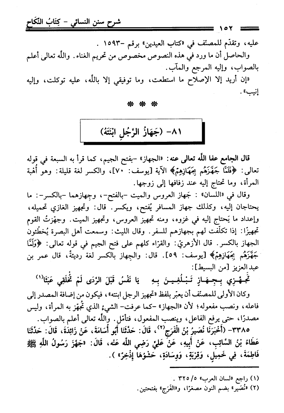 وكان الأولى للمصنّف أن يعبّر بلفظ "تجهيز الرجل ابنته"، فيكون من إضافة المصدر إلى فاعله، ونصب مفعوله؛ لأن "الجهاز" -كما عرفت- الشيءُ الذي تُجهّز به المرأة، وليس مصدرًا، حتى يرفع الفاعل، وينصب المفعول، فتأمّل. واللَّه تعالى أعلم بالصواب.