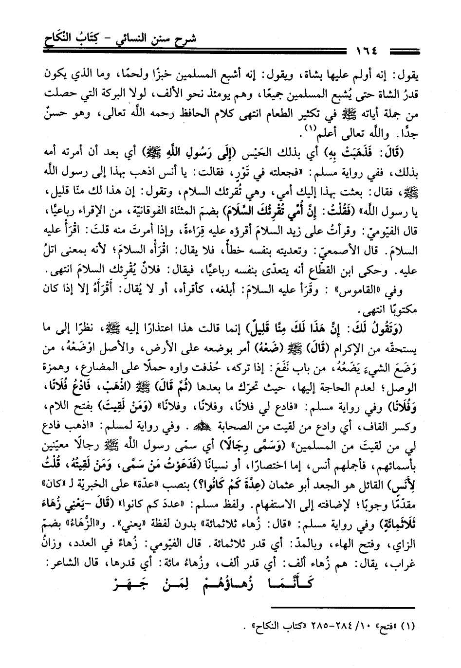 (وَتَقُولُ لَكَ: إِنَّ هَذَا لَكَ مِنَّا قَلِيلٌ) إنما قالت هذا اعتذارًا إليه - صلى اللَّه عليه وسلم -، نظرًا إلى ما يستحقّه من الإكرام (قَالَ) - صلى اللَّه عليه وسلم - (ضَعْهُ) أمر بوضعه على الأرض، والأصل اوْضَعْهُ، من وَضَعَ الشيءَ يَضَعُهُ، من باب نَفَعَ: إذا تركه، حُذفت واوه حملًا على المضارع، وهمزة الوصل؛ لعدم الحاجة إليها، حيث تحرّك ما بعدها (ثُمَّ قَالَ) - صلى اللَّه عليه وسلم - (اذْهَبْ، فادْعُ فُلانًا، وَفُلَانًا) وفي رواية مسلم: "فادع لي فلانًا، وفلانًا، وفلانًا" (وَمَنْ لَقِيتَ) بفتح اللام، وكسر القاف، أي وادع من لقيت من الصحابة - رضي اللَّه عنهم -. وفي رواية لمسلم: "اذهب فادع لي من لقيتَ من المسلمين" (وَسَمَّى رِجالًا) أي سمّى رسول اللَّه - صلى اللَّه عليه وسلم - رجالا معيّنين بأسمائهم، فأجملهم أنس، إما اختصارًا، أو نسيانًا (فَدَعَوْتُ مَنْ سَمَّى، وَمَنْ لَقِيتُهُ، قُلْتُ: لِأَنسٍ) القائل هو الجعد أبو عثمان (عِدَّةَ كَمْ كَانُوا؟) بنصب "عدّة" على الخبريّة لـ"كان" مقدّمًا وجوبًا؛ لإضافته إلى الاستفهام. ولفظ مسلم: "عددَكم كانوا" (قَالَ -يعني زُهَاءَ ثَلاَثَمِائَةٍ) وفي رواية مسلم: "قال: زُهاء ثلاثمائة" بدون لفظة "يعني". و"الزُّهَاءُ" بضمّ الزاي، وفتح الهاء، وبالمدّ: أي قدر ثلاثمائة. قال الفيّوميّ: زُهاءٌ في العدد، وزانُ غراب، يقال: هم زُهاء ألف: أي قدر ألف، وزُهاءُ مائة: أي قدرها، قال الشاعر: كَأَنَّمَا زُهاؤُهُمْ لِمَنْ جَهَرْ
