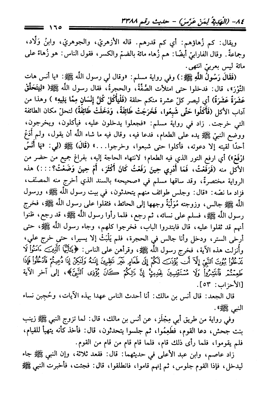 وفي رواية من طريق أبي مِجْلَز، عن أنس بن مالك، قال: لما تزوج النبي - صلى اللَّه عليه وسلم - زينب بنت جحش، دعا القوم، فطَعِمُوا، ثم جلسوا يتحدثون، قال: فأخذ كأنه يتهيأ للقيام، فلم يقوموا، فلما رأى ذلك قام، فلما قام قام من قام من القوم.