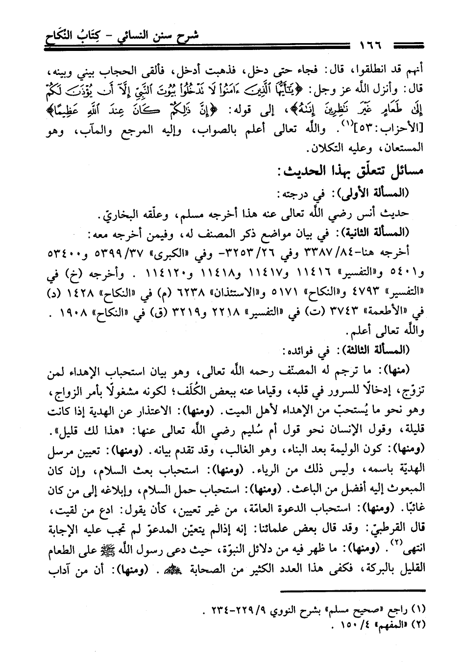 أنهم قد انطلقوا، قال: فجاء حتى دخل، فذهبت أدخل، فألقى الحجاب بيني وبينه، قال: وأنزل اللَّه -عَزَّ وَجَلَّ-: {يَا أَيُّهَا الَّذِينَ آمَنُوا لَا تَدْخُلُوا بُيُوتَ النَّبِيِّ إِلَّا أَنْ يُؤْذَنَ لَكُمْ إِلَى طَعَامٍ غَيْرَ نَاظِرِينَ إِنَاهُ}، إلى قوله: {إِنَّ ذَلِكُمْ كَانَ عِنْدَ اللَّهِ عَظِيمًا} [الأحزاب: 53] (¬1). واللَّه تعالى أعلم بالصواب، وإليه المرجع والمآب، وهو المستعان، وعليه التكلان.