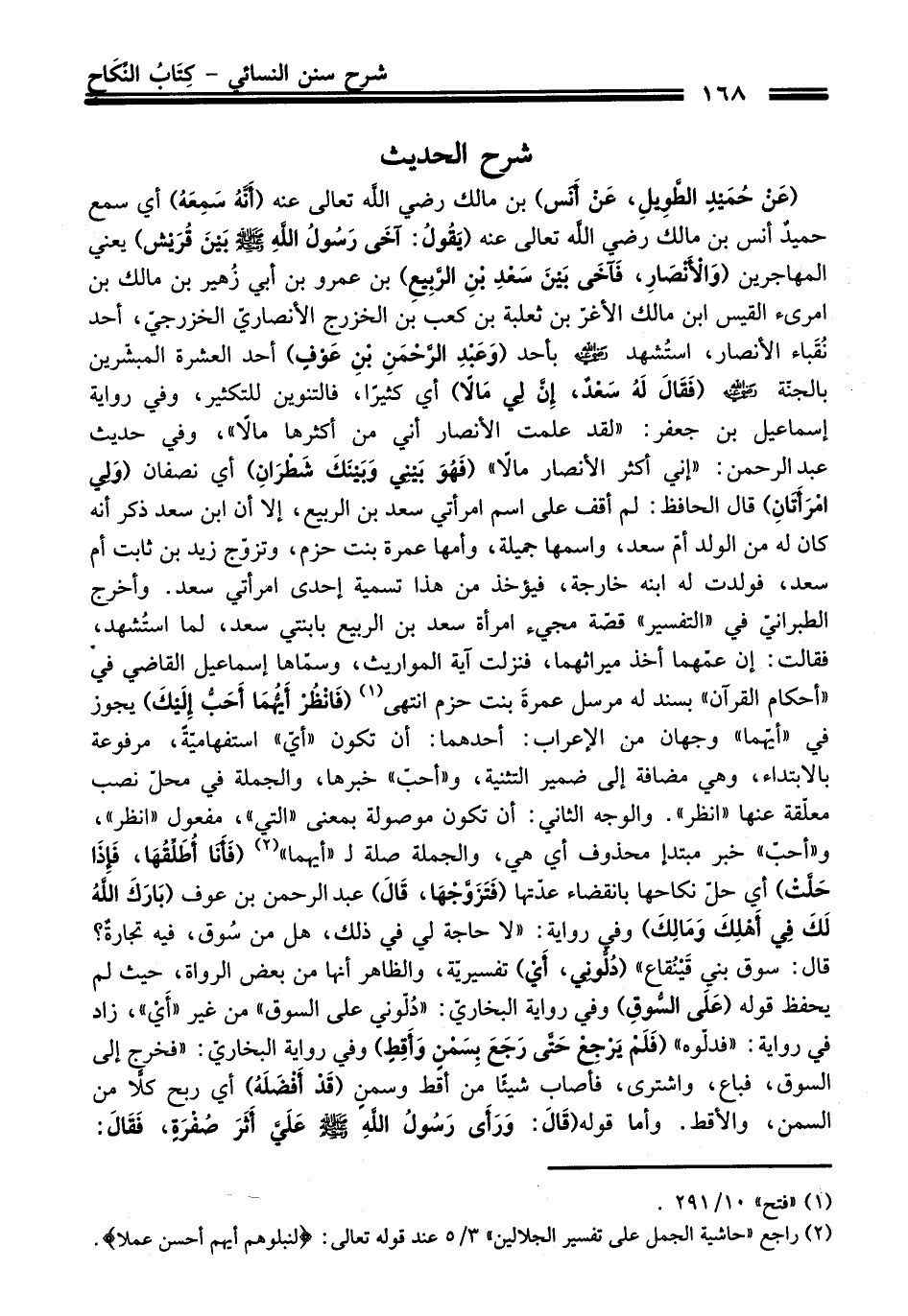 (عَنْ حُمَيْدٍ الطَّوِيلِ، عَنْ أَنَس) بن مالك - رضي اللَّه تعالى عنه - (أَنَّهُ سَمِعَهُ) أي سمع حميدٌ أنس بن مالك - رضي اللَّه تعالى عنه - (يَقُولُ: آخَى رَسُولُ اللهِ - صلى اللَّه عليه وسلم - بَيْنَ قُرَيْش) يعني المهاجرين (والأَنصارِ، فآخَى بَيْنَ سَعْدِ بْنِ الرَّبِيعِ) بن عمرو بن أبي زُهير بن مالك بن امرئ القيس ابن مالك الأغرّ بن ثعلبة بن كعب بن الخزرج الأنصاريّ الخزرجيّ، أحد نُقَباء الأنصار، استُشهد - رضي اللَّه عنه - بأحد (وَعَبْدِ الرَّحْمَنِ بْنِ عَوْفٍ) أحد العشرة المبشرين بالجنة - رضي اللَّه عنه - (فَقالَ لَهُ سَعْدٌ، إِنَّ لِي مالًا) أي كثيرًا، فالتنوين للتكثير، وفي رواية إسماعيل بن جعفر: "لقد علمت الأنصار أني من أكثرها مالًا"، وفي حديث عبد الرحمن: "إني أكثر الأنصار مالًا" (فَهُوَ بَيْنِي وَبَيْنَكَ شَطْرانِ) أي نصفان (وَلِي امْرَأَتَانِ) قال الحافظ: لم أقف على اسم امرأتي سعد بن الربيع، إلا أن ابن سعد ذكر أنه كان له من الولد أمّ سعد، واسمها جميلة، وأمها عمرة بنت حزم، وتزوّج زيد بن ثابت أم سعد، فولدت له ابنه خارجة، فيؤخذ من هذا تسمية إحدى امرأتي سعد. وأخرج الطبرانيّ في "التفسير" قصّة مجيء امرأة سعد بن الربيع بابنتي سعد، لما استُشهد، فقالت: إن عمّهما أخذ ميراثهما، فنزلت آية المواريث، وسمّاها إسماعيل القاضي في "أحكام القرآن" بسند له مرسل عمرةَ بنت حزم انتهى (¬1) (فانْظُرْ أَيُّهُمَا أَحَبُّ إِلَيْكَ) يجوز في "أيّهما" وجهان من الإعراب: أحدهما: أن تكون "أيّ" استفهاميّةً، مرفوعة بالابتداء، وهي مضافة إلى ضمير التثنية، و"أحبّ" خبرها، والجملة في محلّ نصب معلّقة عنها "انظر". والوجه الثاني: أن تكون موصولة بمعنى "التي"، مفعول "انظر"، و"أحبّ" خبر مبتدإ محذوف أي هي، والجملة صلة لـ"أيهما" (¬2) (فَأَنَا أُطَلِّقُهَا، فَإِذَا حَلَّتْ) أي حلّ نكاحها بانقضاء عدّتها (فَتَزَوَّجْهَا، قَالَ) عبد الرحمن بن عوف (بارَكَ اللَّهُ لَكَ فِي أَهْلِكَ وَمالِكَ) وفي رواية: "لا حاجة لي في ذلك، هل من سُوق، فيه تجارةٌ؟ قال: سوق بني قَيْنُقاع" (دُلُّونِي، أَيْ) تفسيريّة، والظاهر أنها من بعض الرواة، حيث لم يحفظ قوله (عَلَى السُّوقِ) وفي رواية البخاريّ: "دُلّوني على السوق" من غير "أَيْ"، زاد في رواية: "فدلّوه" (فَلَمْ يَرْجِعْ حَتَّى رَجَعَ بِسَمْنٍ وَأَقِطٍ) وفي رواية البخاريّ: "فخرج إلى السوق، فباع، واشترى، فأصاب شيئًا من أقط وسمنٍ (قَدْ أَفْضَلَهُ) أي ربح كلًّا من السمن، والأقط. وأما قوله (قَالَ: وَرَأَى رَسُولُ اللَّهِ - صلى اللَّه عليه وسلم - عَلَيَّ أَثَرَ صُفْرَةٍ، فَقَالَ: