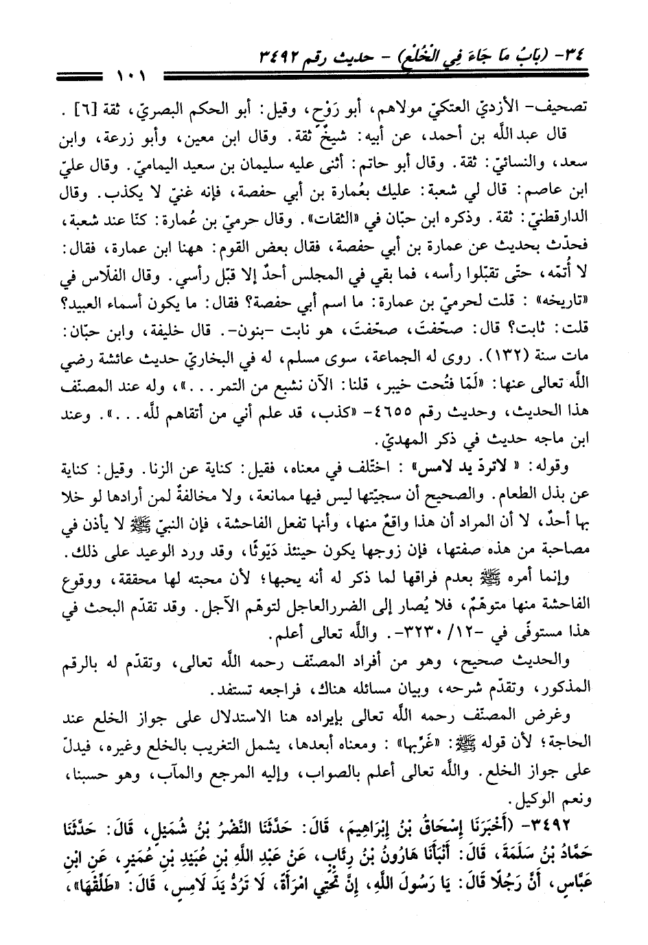 3492 - (أَخْبَرَنَا إِسْحَاقُ بْنُ إِبْرَاهِيمَ, قَالَ: حَدَّثَنَا النَّضْرُ بْنُ شُمَيْلٍ, قَالَ: حَدَّثَنَا حَمَّادُ بْنُ سَلَمَةَ, قَالَ: أَنْبَأَنَا هَارُونُ بْنُ رِئَابٍ, عَنْ عَبْدِ اللَّهِ بْنِ عُبَيْدِ بْنِ عُمَيْرٍ, عَنِ ابْنِ عَبَّاسٍ, أَنَّ رَجُلاً قَالَ: يَا رَسُولَ اللهِ, إِنَّ تَحْتِي امْرَأَةً, لاَ تَرُدُّ يَدَ لاَمِسٍ, قَالَ: «طَلِّقْهَا».