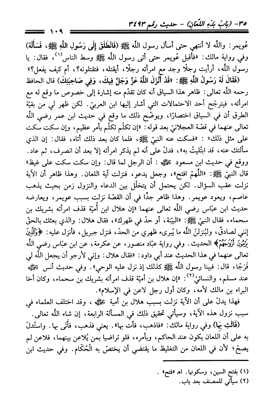 عُويمر: واللَّه لا أنتهي حتى أسال رسول اللَّه - صلى اللَّه عليه وسلم - (فَانْطَلَقَ إِلَى رَسُولِ اللَّهِ - صلى اللَّه عليه وسلم -، فَسَأَلَهُ) وفي رواية مالك: "فأقبل عُويمر حتى أتى رسول اللَّه - صلى اللَّه عليه وسلم - وسط الناس (¬1)، فقال: يا رسول اللَّه، أرأيت رجلاً وجد مع امرأته رجلاً، أيقتده، فتقتدونه؟، أم كيف يفعل؟ " (فَقَالَ: لَهُ رَسُولُ اللهِ - صلى اللَّه عليه وسلم -: "قَدْ أَنْزَلَ اللَّهُ -عَزَّ وَجَلَّ- فِيكَ، وَفِي صَاحِبَتِكَ) قال الحافظ -رحمه اللَّه تعالى-: ظاهر هذا السياق أنه كان تقدّم منه إشارة إلى خصوص ما وقع له مع امرأته، فيترجّح أحد الاحتمالات التي أشار إليها ابن العربيّ. لكن ظهر لي من بقيّة الطرق أن في السياق اختصارًا، ويوضّح ذلك ما وقع في حديث ابن عمر - رضي اللَّه تعالى عنهما - في قصّة العجلانيّ بعد قوله: "إن تكلّم تكلّم بأمر عظيم، وإن سكت سكت على مثل ذلك": "فسكت عنه النبيّ - صلى اللَّه عليه وسلم -، فلما كان بعد ذلك أتاه، فقال: إن الذي سألتك عنه، قد ابتُليتُ به"، فدلّ على أنه لم يذكر امرأته إلا بعد أن انصرف، ثم عاد. ووقع في حديث ابن مسعود - رضي اللَّه عنه -: أن الرجل لما قال: "وإن سكت سكت على غيظ" قال النبيّ - صلى اللَّه عليه وسلم -: "اللَّهمّ افتح"، وجعل يدعو، فنزلت آية اللعان. وهذا ظاهر أن الآية نزلت عقب السؤال. لكن يحتمل أن يتخلّل بين الدعاء والنزول زمن بحيث يذهب عاصم، ويعود عويمر. وهذا ظاهر جدًّا في أن القصّة نزلت بسبب عويمر، ويعارضه حديث ابن عبّاس - رضي اللَّه تعالى عنهما - "إن هلال ابن أُميّة قذف امرأته بشريك بن سحماء، فقال النبيّ - صلى اللَّه عليه وسلم -: "البيّنة، أو حدّ في ظهرك"، فقال هلال: والذي بعثك بالحقّ إنني لصادقٌ، وليُنزلنّ اللَّه ما يُبرىء ظهري من الحدّ، فنزل جبريل، فأنزل عليه: {وَالَّذِينَ يَرْمُونَ أَزْوَاجَهُمْ} الحديث. وفي رواية عبّاد منصور، عن عكرمة، عن ابن عبّاس - رضي اللَّه تعالى عنهما - في هذا الحديث عند أبي داود: "فقال هلال: وإني لأرجو أن يجعل اللَّه لي فَرَجًا، قال: فبينا رسول اللَّه - صلى اللَّه عليه وسلم - كذلك إذ نزل عليه الوحي". وفي حديث أنس - رضي اللَّه عنه - عند مسلم، والنسائيّ (¬2): "إن هلال بن أميّة قذف امرأته بشريك بن سحماء، وكان أخا البراء بن مالك لأمه، وكان أول رجل لاعن في الإسلام".