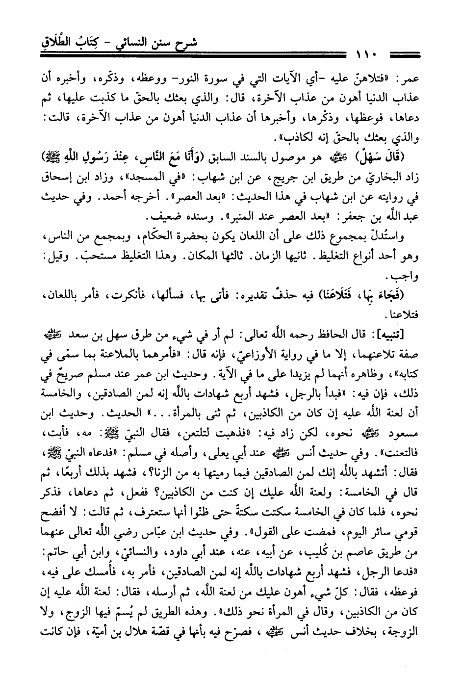 [تنبيه]: قال الحافظ -رحمه اللَّه تعالى-: لم أر في شيء من طرق سهل بن سعد - رضي اللَّه عنه - صفة تلاعنهما، إلا ما في رواية الأوزاعيّ، فإنه قال: "فأمرهما بالملاعنة بما سمّى في كتابه"، وظاهره أنهما لم يزيدا على ما في الآية. وحديث ابن عمر عند مسلم صريحٌ في ذلك، فإن فيه: "فبدأ بالرجل، فشهد أربع شهادات باللَّه إنه لمن الصادقين، والخامسة أن لعنة اللَّه عليه إن كان من الكاذبين، ثم ثنى بالمرأة ... " الحديث. وحديث ابن مسعود - رضي اللَّه عنه - نحوه، لكن زاد فيه: "فذهبت لتلتعن، فقال النبيّ - صلى اللَّه عليه وسلم -: مه، فأبت، فالتعنت". وفي حديث أنس - رضي اللَّه عنه - عند أبي يعلى، وأصله في مسلم: "فدعاه النبيّ - صلى اللَّه عليه وسلم -، فقال: أتشهد باللَّه إنك لمن الصادقين فيما رميتها به من الزنا؟، فشهد بذلك أربعًا، ثم قال في الخامسة: ولعنة اللَّه عليك إن كنت من الكاذبين؟ ففعل، ثم دعاها، فذكر نحوه، فلما كان في الخامسة سكتت سكتةً حتى ظنّوا أنها ستعترف، ثم قالت: لا أفضح قومي سائر اليوم، فمضت على القول". وفي حديث ابن عبّاس - رضي اللَّه تعالى عنهما - من طريق عاصم بن كُليب، عن أبيه، عنه، عند أبي داود، والنسائيّ، وابن أبي حاتم: "فدعا الرجل، فشهد أربع شهادات باللَّه إنه لمن الصادقين، فأمر به، فأُمسك على فيه، فوعظه، فقال: كلّ شيء أهون عليك من لعنة اللَّه، ثم أرسله، فقال: لعنة اللَّه عليه إن كان من الكاذبين، وقال في المرأة نحو ذلك". وهذه الطريق لم يُسمّ فيها الزوج، ولا الزوجة، بخلاف حديث أنس - رضي اللَّه عنه -، فصرّح فيه بأنها في قصّة هلال بن أميّة، فإن كانت