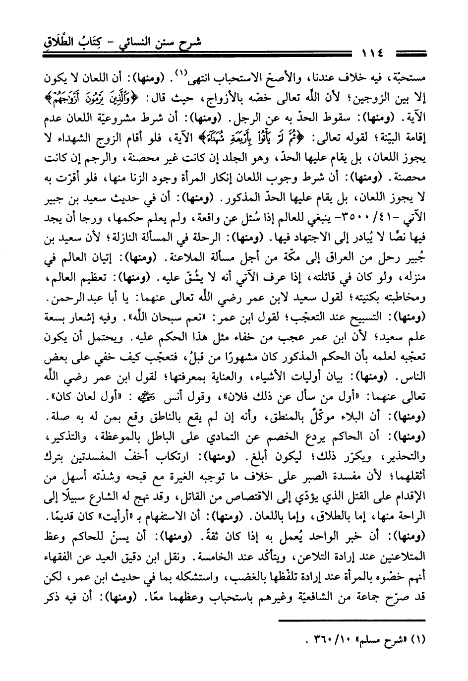 مستحبّة، فيه خلاف عندنا، والأصحّ الاستحباب انتهى (¬1). (ومنها): أن اللعان لا يكون إلا بين الزوجين؛ لأن اللَّه تعالى خصّه بالأزواج، حيث قال: {وَالَّذِينَ يَرْمُونَ أَزْوَاجَهُمْ} الآية. (ومنها): سقوط الحدّ به عن الرجل. (ومنها): أن شرط مشروعيّة اللعان عدم إقامة البيّنة؛ لقوله تعالى: {ثُمَّ لَمْ يَأْتُوا بِأَرْبَعَةِ شُهَدَاءَ} الآية، فلو أقام الزوج الشهداء لا يجوز اللعان، بل يقام عليها الحدّ، وهو الجلد إن كانت غير محصنة، والرجم إن كانت محصنة. (ومنها): أن شرط وجوب اللعان إنكار المرأة وجود الزنا منها، فلو أقرّت به لا يجوز اللعان، بل يقام عليها الحدّ المذكور. (ومنها): أن في حديث سعيد بن جبير الآتي -41/ 3500 - ينبغي للعالم إذا سُئل عن واقعة، ولم يعلم حكمها، ورجا أن يجد فيها نصًّا لا يُبادر إلى الاجتهاد فيها. (ومنها): الرحلة في المسألة النازلة؛ لأن سعيد بن جُبير رحل من العراق إلى مكّة من أجل مسألة الملاعنة. (ومنها): إتيان العالم في منزله، ولو كان في قائلته، إذا عرف الآتي أنه لا يشُقّ عليه. (ومنها): تعظيم العالم، ومخاطبته بكنيته؛ لقول سعيد لابن عمر - رضي اللَّه تعالى عنهما -: يا أبا عبد الرحمن. (ومنها): التسبيح عند التعجّب؛ يقول ابن عمر: "نعم سبحان اللَّه". وفيه إشعار بسعة علم سعيد؛ لأن ابن عمر عجب من خفاء مثل هذا الحكم عليه. ويحتمل أن يكون تعجبه لعلمه بأن الحكم المذكور كان مشهورًا من قبلُ، فتعجّب كيف خفي على بعض الناس. (ومنها): بيان أوليات الأشياء، والعناية بمعرفتها؛ لقول ابن عمر - رضي اللَّه تعالى عنهما -: "أول من سأل عن ذلك فلان"، وقول أنس - رضي اللَّه عنه -: "أول لعان كان". (ومنها): أن البلاء موكّلٌ بالمنطق، وأنه إن لم يقع بالناطق وقع بمن له به صلة. (ومنها): أن الحاكم يردع الخصم عن التمادي على الباطل بالموعظة، والتذكير، والتحذير، ويكرّر ذلك؛ ليكون أبلغ. (ومنها): ارتكاب أخفّ المفسدتين بترك أثقلهما؛ لأن مفسدة الصبر على خلاف ما توجبه الغيرة مع قبحه وشدّته أسهل من الإقدام على القتل الذي يؤدّي إلى الاقتصاص من القاتل، وقد نهج له الشارع سبيلاً إلى الراحة منها، إما بالطلاق، وإما باللعان. (ومنها): أن الاستفهام بـ "أرأيت" كان قديمًا. (ومنها): أن خبر الواحد يُعمل به إذا كان ثقةً. (ومنها): أن يسنّ للحاكم وعظ المتلاعنين عند إرادة التلاعن، ويتأكّد عند الخامسة. ونقل ابن دقيق العيد عن الفقهاء أنهم خصّوه بالمرأة عند إرادة تلفّظها بالغضب، واستشكله بما في حديث ابن عمر، لكن قد صرّح جماعة من الشافعيّة وغيرهم باستحباب وعظهما معًا. (ومنها): أن فيه ذكر