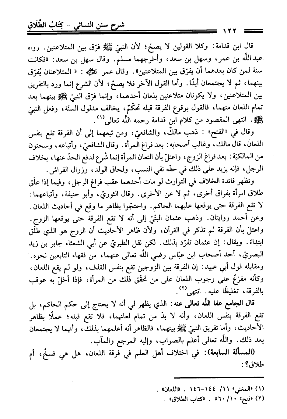 قال ابن قدامة: وكلا القولين لا يصحّ؛ لأن النبيّ - صلى الله عليه وسلم - فرّق بين المتلاعنين. رواه عبد الله بن عمر، وسهل بن سعد، وأخرجهما مسلم. وقال سهل بن سعد: "فكانت سنة لمن كان بعدهما أن يفرّق بين المتلاعنين". وقال عمر - رضي الله عنه -: "المتلاعنان يُفرّق بينهما، ثم لا يجتمعان أبدًا. وأما القول الآخر فلا يصحّ؛ لأن الشرع إنما ورد بالتفريق بين المتلاعنين، ولا يكونان متلاعنين بلعان أحدهما، وإنما فرّق النبيّ - صلى الله عليه وسلم - بينهما بعد تمام اللعان منهما، فالقول بوقوع الفرقة قبله تحكّمٌ، يخالف مدلول السنّة، وفعل النبيّ - صلى الله عليه وسلم -. انتهى المقصود من كلام ابن قدامة رحمه الله تعالى (¬1).
