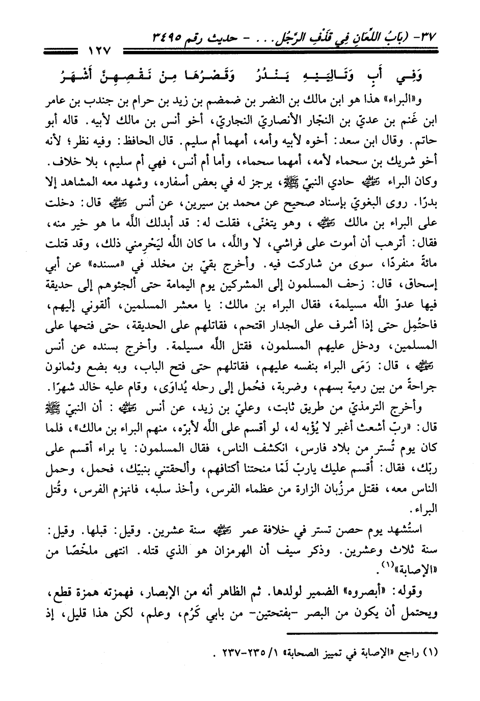 و"البراء" هذا هو ابن مالك بن النضر بن ضمضم بن زيد بن حرام بن جندب بن عامر ابن غَنم بن عديّ بن النجّار الأنصاريّ النجاريّ، أخو أنس بن مالك لأبيه. قاله أبو حاتم. وقال ابن سعد: أخوه لأبيه وأمه، أمهما أم سليم. قال الحافظ: وفيه نظر؛ لأنه أخو شريك بن سحماء لأمه، أمهما سحماء، وأما أم أنس، فهي أم سليم، بلا خلاف. وكان البراء - رضي اللَّه عنه - حادي النبيّ - صلى اللَّه عليه وسلم -، يرجز له في بعض أسفاره، وشهد معه المشاهد إلا بدرًا. روى البغويّ بإسناد صحيح عن محمد بن سيرين، عن أنس - رضي اللَّه عنه - قال: دخلت على البراء بن مالك - رضي اللَّه عنه -، وهو يتغنّى، فقلت له: قد أبدلك اللَّه ما هو خير منه، فقال: أترهب أن أموت على فراشي، لا واللَّه، ما كان اللَّه ليَحْرِمني ذلك، وقد قتلت مائة منفردَا، سوى من شاركت فيه. وأخرج بقي بن مخلد في "مسنده" عن أبي إسحاق، قال: زحف المسلمون إلى المشركين يوم اليمامة حتى ألجئوهم إلى حديقة فيها عدوّ اللَّه مسيلمة، فقال البراء بن مالك: يا معشر المسلمين، ألقوني إليهم، فاحتُمِل حتى إذا أشرف على الجدار اقتحم، فقاتلهم على الحديقة، حتى فتحها على المسلمين، ودخل عليهم المسلمون، فقتل اللَّه مسيلمة. وأخرج بسنده عن أنس - رضي اللَّه عنه -، قال: رَمَى البراء بنفسه عليهم، فقاتلهم حتى فتح الباب، وبه بضع وثمانون جراحةً من بين رمية بسهم، وضربة، فحُمل إلى رحله يُداوَى، وقام عليه خالد شهرًا.