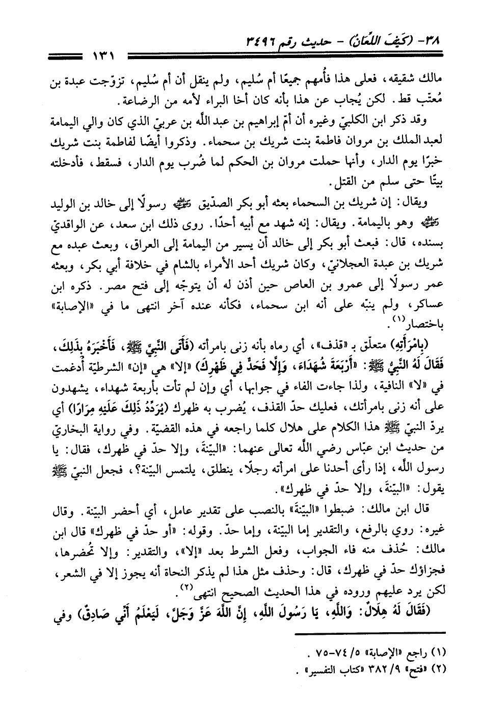 (بامْرَأَتِهِ) متعلّق بـ "قذف"، أي رماه بأنه زنى بامرأته (فَأَتَى النَّبِيَّ - صلى اللَّه عليه وسلم -، فَأَخْبَرَهُ بذَلِكَ، فَقَالَ: لَهُ النَّبِيُّ - صلى اللَّه عليه وسلم -: "أَرْبَعَةَ شُهَدَاءَ، وَإِلاَّ فَحَدٌّ فِي ظَهْرِكَ) "إلا" هي "إن" الشرطيّة أُدغمت في "لا" النافية، ولذا جاءت الفاء في جوابها، أي وإن لم تأت بأربعة شهداء، يشهدون على أنه زنى بامرأتك، فعليك حد القذف، يُضرب به ظهرك (يُرَدِّدُ ذَلِكَ عَلَيْهِ مِرَارًا) أي يردّ النبيّ - صلى اللَّه عليه وسلم - هذا الكلام على هلال كلما راجعه في هذه القضية. وفي رواية البخاريّ من حديث ابن عبّاس - رضي اللَّه تعالى عنهما -: "البيّنةَ، وإلا حدّ في ظهرك، فقال: يا رسول اللَّه، إذا رأى أحدنا على امرأته رجلاً، ينطلق، يلتمس البيّنة؟، فجعل النبيّ - صلى اللَّه عليه وسلم - يقول: "البيّنةَ، وإلا حدّ في ظهرك".