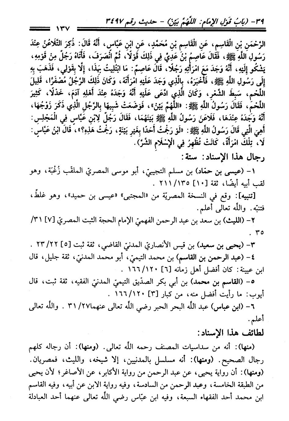 الرَّحْمَنِ بْنِ الْقَاسِمِ, عَنِ الْقَاسِمِ بْنِ مُحَمَّدٍ, عَنِ ابْنِ عَبَّاسٍ, أَنَّهُ قَالَ: ذُكِرَ التَّلاَعُنُ عِنْدَ رَسُولِ اللهِ - صلى اللَّه عليه وسلم -, فَقَالَ عَاصِمُ بْنُ عَدِيٍّ فِي ذَلِكَ قَوْلاً, ثُمَّ انْصَرَفَ, فَأَتَاهُ رَجُلٌ مِنْ قَوْمِهِ, يَشْكُو إِلَيْهِ, أَنَّهُ وَجَدَ مَعَ امْرَأَتِهِ رَجُلاً, قَالَ عَاصِمٌ: مَا ابْتُلِيتُ بِهَذَا, إِلاَّ بِقَوْلِي, فَذَهَبَ بِهِ إِلَى رَسُولِ اللهِ - صلى اللَّه عليه وسلم -, فَأَخْبَرَهُ, بِالَّذِي وَجَدَ عَلَيْهِ امْرَأَتَهُ, وَكَانَ ذَلِكَ الرَّجُلُ مُصْفَرًّا, قَلِيلَ اللَّحْمِ, سَبِطَ الشَّعَرِ, وَكَانَ الَّذِي ادَّعَى عَلَيْهِ أَنَّهُ وَجَدَهُ عِنْدَ أَهْلِهِ آدَمَ, خَدْلاً, كَثِيرَ اللَّحْمِ, فَقَالَ رَسُولُ اللهِ - صلى اللَّه عليه وسلم -: «اللَّهُمَّ بَيِّنْ» , فَوَضَعَتْ شَبِيهًا بِالرَّجُلِ الَّذِي ذَكَرَ زَوْجُهَا, أَنَّهُ وَجَدَهُ عِنْدَهَا, فَلاَعَنَ رَسُولُ اللهِ - صلى اللَّه عليه وسلم - بَيْنَهُمَا, فَقَالَ رَجُلٌ لاِبْنِ عَبَّاسٍ فِي الْمَجْلِسِ: أَهِيَ الَّتِي قَالَ رَسُولُ اللهِ - صلى اللَّه عليه وسلم -: «لَوْ رَجَمْتُ أَحَدًا بِغَيْرِ بَيِّنَةٍ, رَجَمْتُ هَذِهِ؟» , قَالَ ابْنُ عَبَّاسٍ: لاَ, تِلْكَ امْرَأَةٌ, كَانَتْ تُظْهِرُ فِي الإِسْلاَمِ الشَّرَّ).