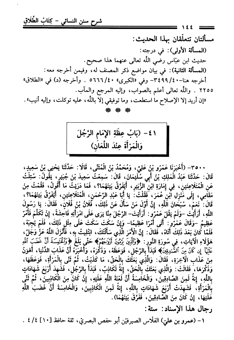 3500 - (أَخْبَرَنَا عَمْرُو بْنُ عَلِيٍّ, وَمُحَمَّدُ بْنُ الْمُثَنَّى, قَالاَ: حَدَّثَنَا يَحْيَى بْنُ سَعِيدٍ, قَالَ: حَدَّثَنَا عَبْدُ الْمَلِكِ بْنُ أَبِي سُلَيْمَانَ, قَالَ: سَمِعْتُ سَعِيدَ بْنَ جُبَيْرٍ, يَقُولُ: سُئِلْتُ عَنِ الْمُتَلاَعِنَيْنِ, فِي إِمَارَةِ ابْنِ الزُّبَيْرِ, أَيُفَرَّقُ بَيْنَهُمَا؟ , فَمَا دَرَيْتُ مَا أَقُولُ, فَقُمْتُ مِنْ مَقَامِي, إِلَى مَنْزِلِ ابْنِ عُمَرَ, فَقُلْتُ: يَا أَبَا عَبْدِ الرَّحْمَنِ, الْمُتَلاَعِنَيْنِ, أَيُفَرَّقُ بَيْنَهُمَا؟ , قَالَ: نَعَمْ, سُبْحَانَ اللَّهِ, إِنَّ أَوَّلَ مَنْ سَأَلَ عَنْ ذَلِكَ, فُلاَنُ بْنُ فُلاَنٍ, فَقَالَ: يَا رَسُولَ اللهِ, أَرَأَيْتَ -وَلَمْ يَقُلْ عَمْرٌو أَرَأَيْتَ- الرَّجُلَ مِنَّا يَرَى عَلَى امْرَأَتِهِ فَاحِشَةً, إِنْ تَكَلَّمَ فَأَمْرٌ عَظِيمٌ -وَقَالَ عَمْرٌو: أَتَى أَمْرًا عَظِيمًا- وَإِنْ سَكَتَ سَكَتَ عَلَى مِثْلِ ذَلِكَ, فَلَمْ يُجِبْهُ, فَلَمَّا كَانَ بَعْدَ ذَلِكَ أَتَاهُ, فَقَالَ: إِنَّ الأَمْرَ الَّذِي سَأَلْتُكَ, ابْتُلِيتُ بِهِ, فَأَنْزَلَ اللَّهُ -عَزَّ وَجَلَّ-, هَؤُلاَءِ الآيَاتِ, فِي سُورَةِ النُّورِ: {وَالَّذِينَ يَرْمُونَ أَزْوَاجَهُمْ} حَتَّى بَلَغَ {وَالْخَامِسَةَ أَنَّ غَضَبَ اللَّهِ عَلَيْهَا إِنْ كَانَ مِنَ الصَّادِقِينَ} فَبَدَأَ بِالرَّجُلِ, فَوَعَظَهُ, وَذَكَّرَهُ, وَأَخْبَرَهُ أَنَّ عَذَابَ الدُّنْيَا, أَهْوَنُ مِنْ عَذَابِ الآخِرَةِ, فَقَالَ: وَالَّذِي بَعَثَكَ بِالْحَقِّ, مَا كَذَبْتُ, ثُمَّ ثَنَّى بِالْمَرْأَةِ, فَوَعَظَهَا, وَذَكَّرَهَا, فَقَالَتْ: وَالَّذِي بَعَثَكَ بِالْحَقِّ, إِنَّهُ لَكَاذِبٌ, فَبَدَأَ بِالرَّجُلِ, فَشَهِدَ أَرْبَعَ شَهَادَاتٍ بِاللَّهِ, إِنَّهُ لَمِنَ الصَّادِقِينَ, وَالْخَامِسَةُ أَنَّ لَعْنَةَ اللَّهِ عَلَيْهِ, إِنْ كَانَ مِنَ الْكَاذِبِينَ, ثُمَّ ثَنَّى بِالْمَرْأَةِ, فَشَهِدَتْ أَرْبَعَ شَهَادَاتٍ بِاللَّهِ, إِنَّهُ لَمِنَ الْكَاذِبِينَ, وَالْخَامِسَةَ أَنَّ غَضَبَ اللَّهِ عَلَيْهَا, إِنْ كَانَ مِنَ الصَّادِقِينَ, فَفَرَّقَ بَيْنَهُمَا).
