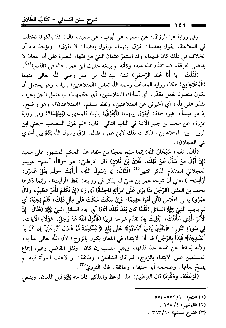 وفي رواية عبد الرزاق، عن معمر، عن أيوب، عن سعيد، قال: كنّا بالكوفة نختلف في الملاعنة، يقول بعضنا: يفرّق بينهما، ويقول بعضنا: لا يفرّق". ويؤخذ منه أن الخلاف في ذلك كان قديمًا، وقد استمر عثمان البتّيّ من فقهاء البصرة على أن اللعان لا يقتضي الفرقة، كما تقدّم نقله عنه، وكأنه لم يبلغه حديث ابن عمر. قاله في "الفتح" (¬1).