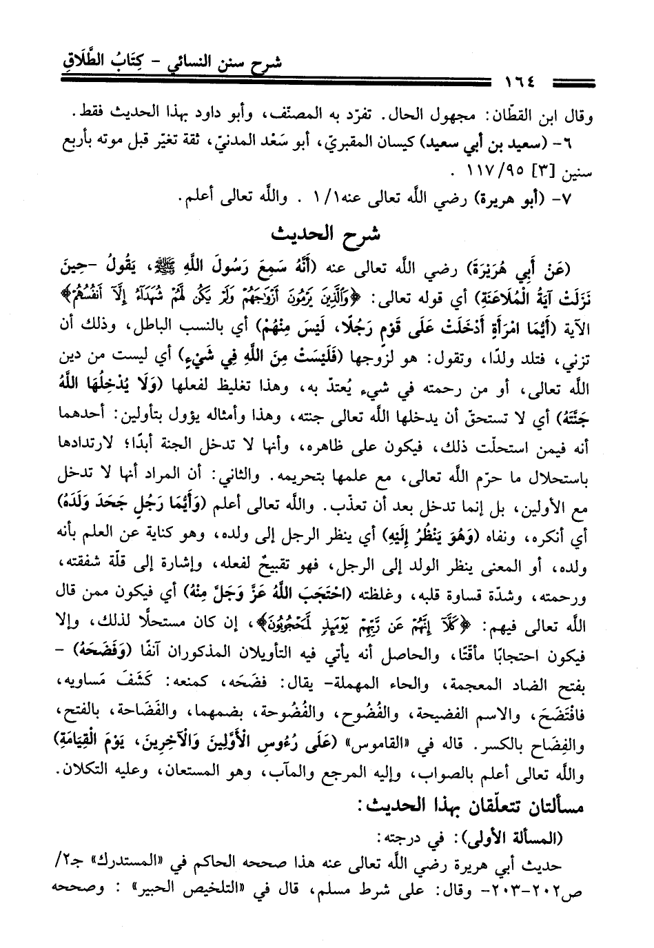 (عَنْ أَبِي هُرَيْرَةَ) - رضي اللَّه تعالى عنه - (أنَّهُ سَمِعَ رَسُولَ اللهِ - صلى اللَّه عليه وسلم -، يَقُولُ- حِينَ نَزَلَث آيَةُ الْمُلَاعَنَةِ) أي قوله تعالى: {وَالَّذِينَ يَرْمُونَ أَزْوَاجَهُمْ وَلَمْ يَكُنْ لَهُمْ شُهَدَاءُ إِلَّا أَنْفُسُهُمْ} الآية (أَيُّمَا امْرَأَةٍ أَدْخَلَتْ عَلَى قَوْمٍ رَجُلاً، لَيْسَ مِنْهُمْ) أي بالنسب الباطل، وذلك أن تزني، فتدد ولدًا، وتقول: هو لزوجها (فَلَيْسَتْ مِنَ اللَّهِ فِي شَيْءٍ) أي ليست من دين اللَّه تعالى، أو من رحمته في شيء يُعتدّ به، وهذا تغليظ لفعلها (وَلَا يُدْخِلُهَا اللَّهُ جَنَّتَهُ) أي لا تستحقّ أن يدخلها اللَّه تعالى جنته، وهذا وأمثاله يؤول بتأولين: أحدهما أنه فيمن استحلّت ذلك، فيكون على ظاهره، وأنها لا تدخل الجنّة أبدًا؛ لارتدادها باستحلال ما حرّم اللَّه تعالى، مع علمها بتحريمه. والثاني: أن المراد أنها لا تدخل مع الأولين، بل إنما تدخل بعد أن تعذّب. واللَّه تعالى أعلم (وَأَيُّمَا رَجُلٍ جَحَدَ وَلَدَهُ) أي اْنكره، ونفاه (وَهُوَ يَنْظُرُ إِلَيْهِ) أي ينظر الرجل إلى ولده، وهو كناية عن العلم بأنه ولده، أو المعنى ينظر الولد إلى الرجل، فهو تقبيحٌ لفعله، وإشارة إلى قلّة شفقته، ورحمته، وشدّة قساوة قلبه، وغلظته (احْتَجَبَ اللَّهُ -عَزَّ وَجَلَّ- مِنْهُ) أي فيكون ممن قال اللَّه تعالى فيهم: {كَلَّا إِنَّهُمْ عَنْ رَبِّهِمْ يَوْمَئِذٍ لَمَحْجُوبُونَ} إن كان مستحلاًّ لذلك، وإلا فيكون احتجابًا مأقّتًا، والحاصل أنه يأتي فيه التأويلان المذكوران آنفًا (وَفَضَحَهُ) - بفتح الضاد المعجمة، والحاء المهملة- يقال: فضَحَه، كمنعه: كَشَفَ مَساويه، فافْتَضَحَ، والاسم الفضيحة، والفُضُوح، والفُضُوحة، بضمهما، والفَضَاحة، بالفتح، والفِضَاح بالكسر. قاله في "القاموس" (عَلَى رُءُوسِ الْأَوَّلِينَ وَالآخِرِينَ، يَوْمَ الْقِيَامَةِ) واللَّه تعالى أعلم بالصواب، وإليه المرجع والمآب، وهو المستعان، وعليه التكلان.