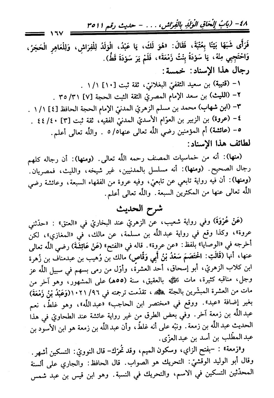 فَرَأَى شَبَهًا بَيِّنًا بِعُتْبَةَ, فَقَالَ: «هُوَ لَكَ, يَا عَبْدُ, الْوَلَدُ لِلْفِرَاشِ, وَلِلْعَاهِرِ الْحَجَرُ, وَاحْتَجِبِى مِنْهُ, يَا سَوْدَةُ بِنْتَ زَمْعَةَ» , فَلَمْ يَرَ سَوْدَةَ قَطُّ).