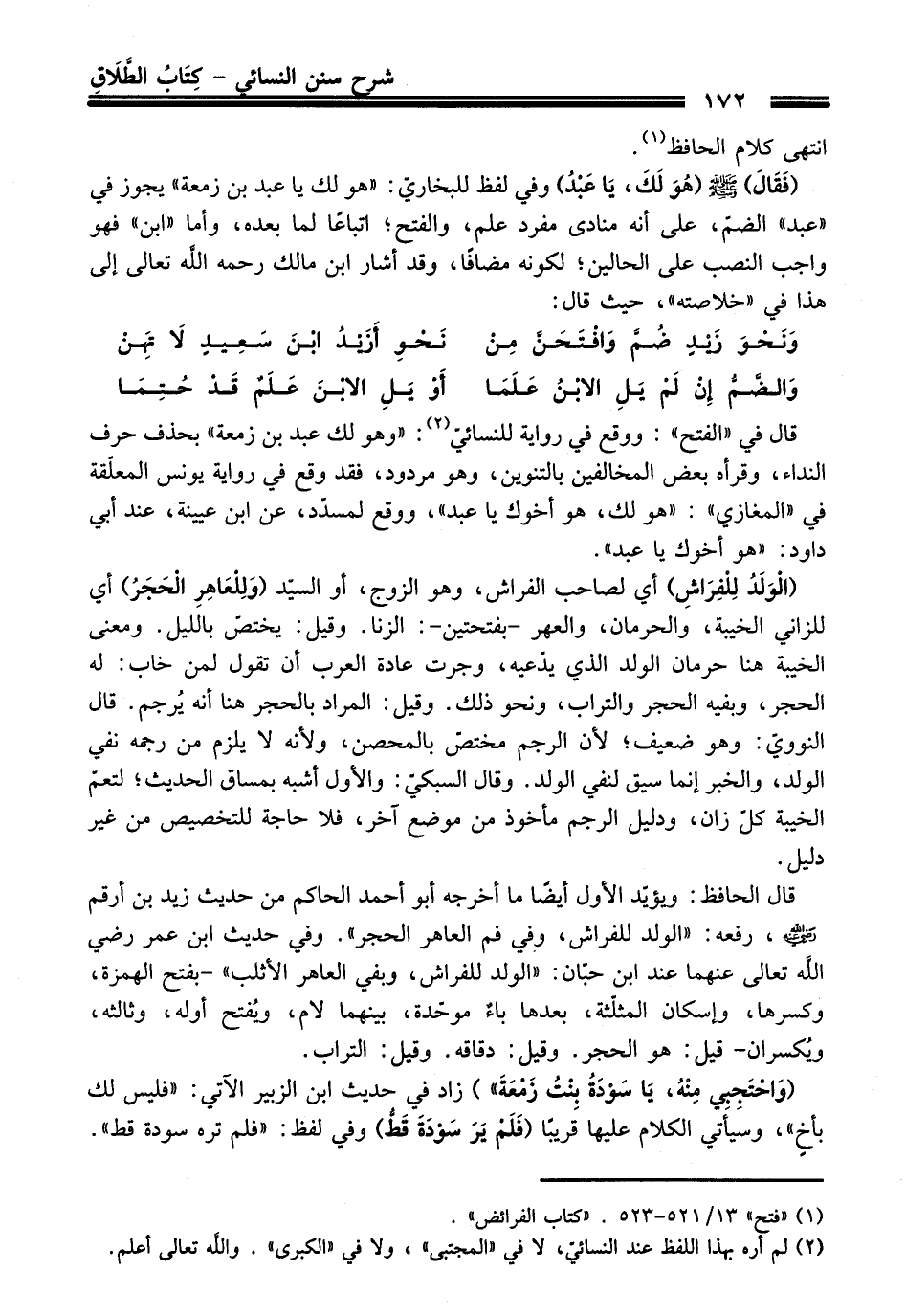 قال في "الفتح": ووقع في رواية للنسائيّ (¬2): "وهو لك عبد بن زمعة" بحذف حرف النداء، وقرأه بعض المخالفين بالتنوين، وهو مردود، فقد وقع في رواية يونس المعلّقة في "المغازي": "هو لك، هو أخوك يا عبد"، ووقع لمسدّد، عن ابن عيينة، عند أبي داود: "هو أخوك يا عبد".