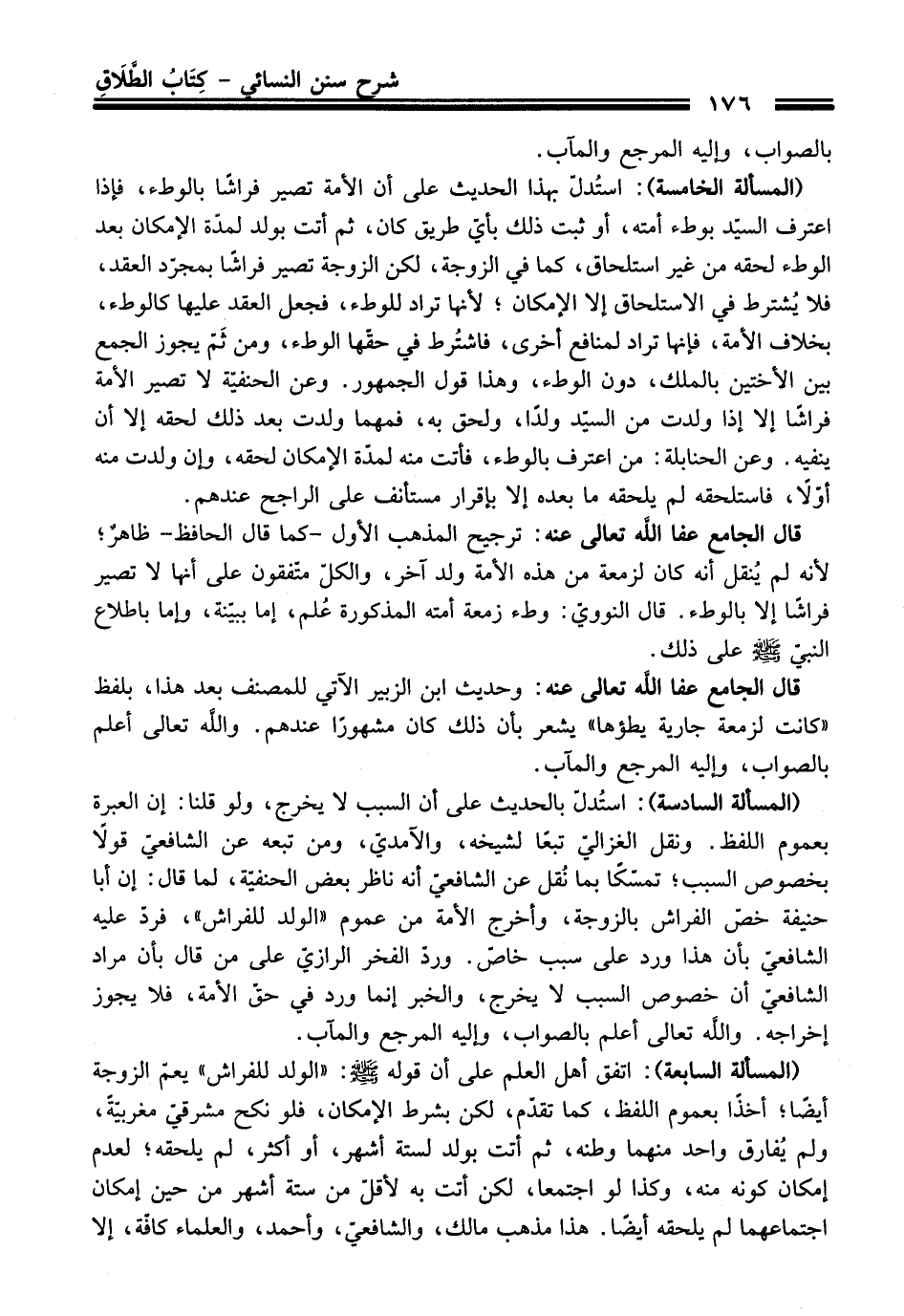 (المسألة السادسة): استُدلّ بالحديث على أن السبب لا يخرج، ولو قلنا: إن العبرة بعموم اللفظ. ونقل الغزاليّ تبعًا لشيخه، والآمديّ، ومن تبعه عن الشافعيّ قولاً بخصوص السبب؛ تمسّكًا بما نُقل عن الشافعيّ أنه ناظر بعض الحنفيّة، لما قال: إن أبا حنيفة خصّ الفراش بالزوجة، وأخرج الأمة من عموم "الولد للفراش"، فردّ عليه الشافعيّ بأن هذا ورد على سبب خاصّ. ورد الفخر الرازيّ على من قال بأن مراد الشافعيّ أن خصوص السبب لا يخرج، والخبر إنما ورد في حقّ الأمة، فلا يجوز إخراجه. واللَّه تعالى أعلم بالصواب، وإليه المرجع والمآب.