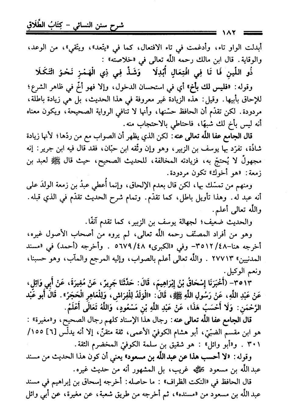 3513 - (أَخْبَرَنَا إِسْحَاقُ بْنُ إِبْرَاهِيمَ, قَالَ: حَدَّثَنَا جَرِيرٌ, عَنْ مُغِيرَةَ, عَنْ أَبِي وَائِلٍ, عَنْ عَبْدِ اللَّهِ, عَنْ رَسُولِ اللهِ - صلى اللَّه عليه وسلم -, قَالَ: «الْوَلَدُ لِلْفِرَاشِ, وَلِلْعَاهِرِ الْحَجَرُ». قَالَ أَبُو عَبْدِ الرَّحْمَنِ: وَلاَ أَحْسُبُ هَذَا, عَنْ عَبْدِ اللَّهِ بْنِ مَسْعُودٍ, وَاللَّهُ تَعَالَى أَعْلَمُ).