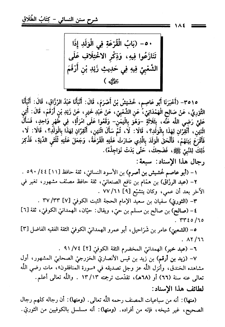 50 - (بَابُ الْقُرْعَةِ فِي الْوَلَدِ إِذَا تَنَازَعُوا فِيهِ، وَذِكْرِ الاخْتِلَافِ عَلَى الشَّعْبِيِّ فِيهِ فِي حَدِيثِ زَيْدِ بْنِ أَرْقَمَ - رضي اللَّه عنه -)