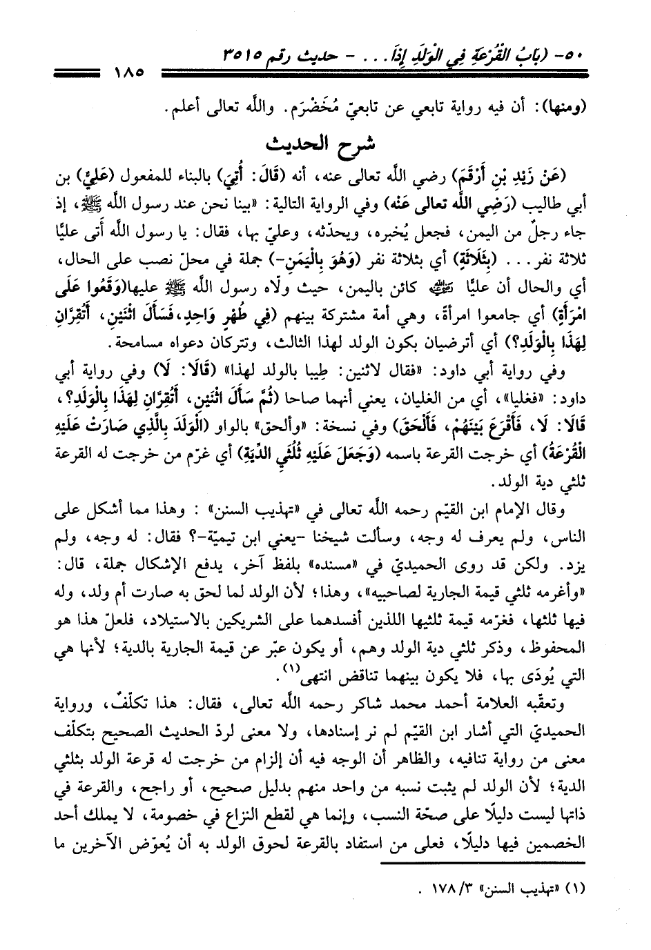 وتعقّبه العلامة أحمد محمد شاكر -رحمه اللَّه تعالى-، فقال: هذا تكلّفٌ، ورواية الحميدي التي أشار ابن القيّم لم نر إسنادها، ولا معنى لردّ الحديث الصحيح بتكلّف معنى من رواية تنافيه، والظاهر أن الوجه فيه أن إلزام من خرجت له قرعة الولد بثلثي الدية؛ لأن الولد لم يثبت نسبه من واحد منهم بدليل صحيح، أو راجح، والقرعة في ذاتها ليست دليلاً على صحّة النسب، وإنما هي لقطع النزاع في خصومة، لا يملك أحد الخصمين فيها دليلاً، فعلى من استفاد بالقرعة لحوق الولد به أن يُعوّض الآخرين ما