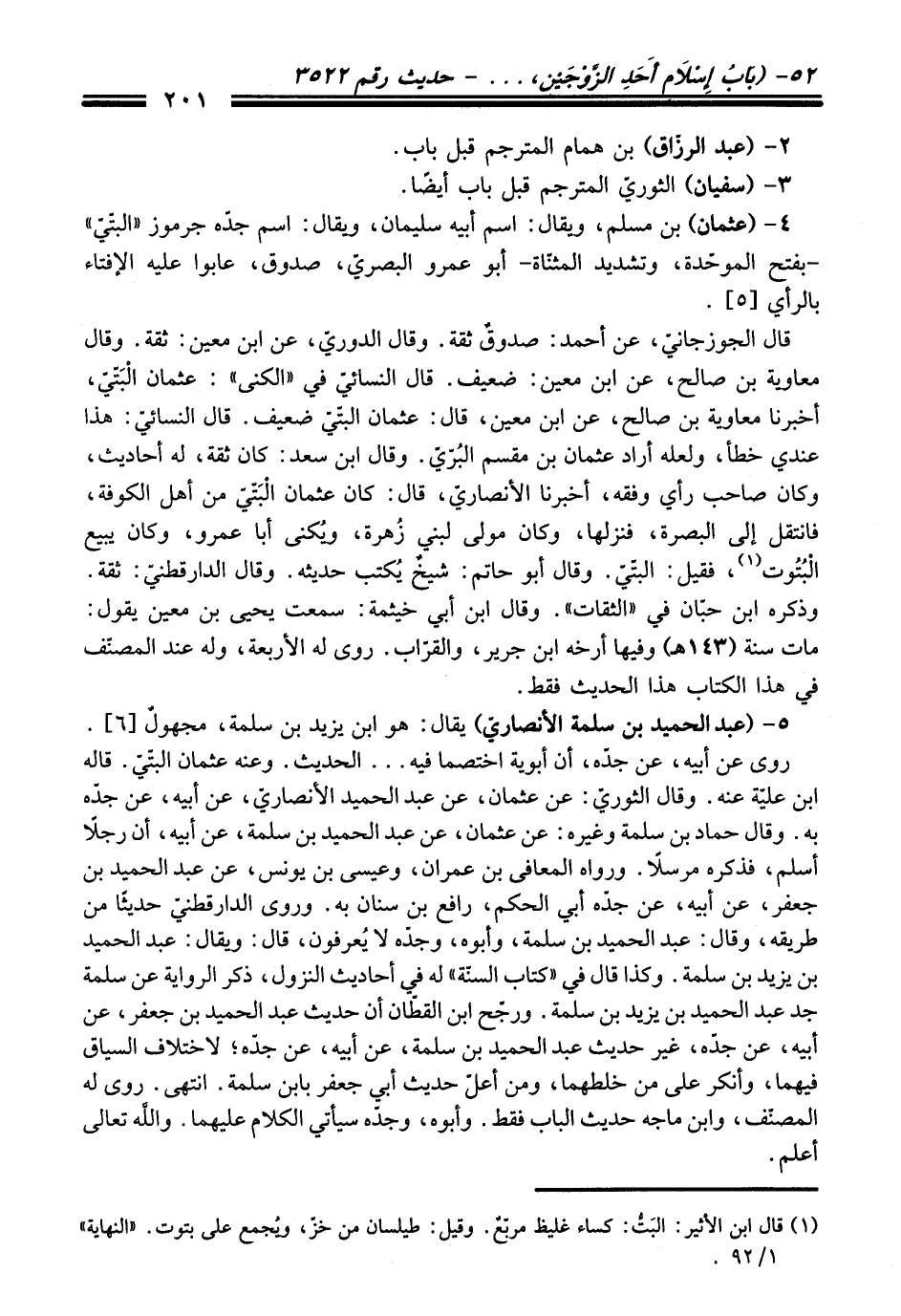 4 - (عثمان) بن مسلم، ويقال: اسم أبيه سليمان، ويقال: اسم جدّه جرموز "البتّيّ" -بفتح الموحّدة، وتشديد المثنّاة- أبو عمرو البصريّ، صدوق، عابوا عليه الإفتاء بالرأي [5].