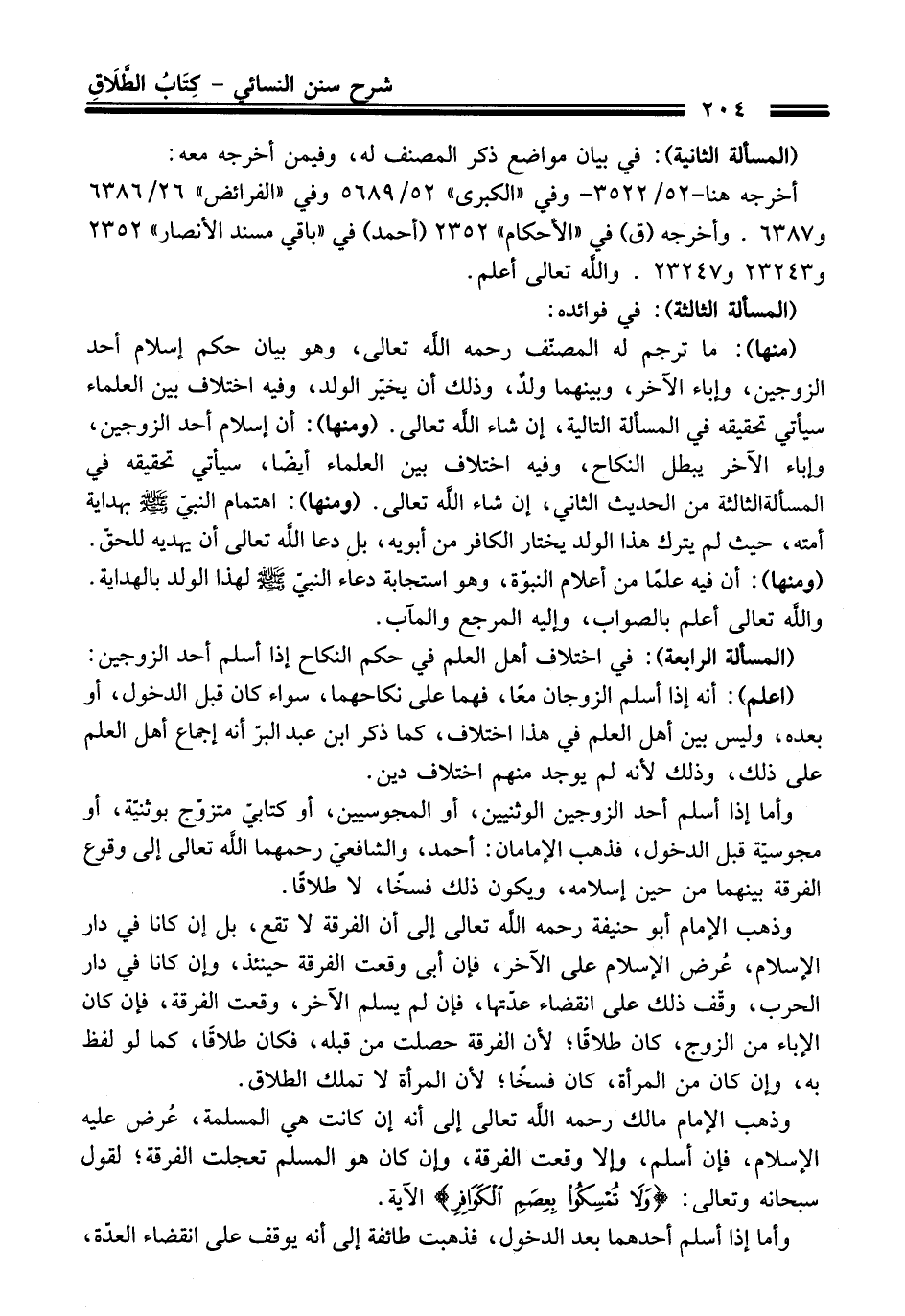 وذهب الإمام مالك -رحمه اللَّه تعالى- إلى أنه إن كانت هي المسلمة، عُرض عليه الإسلام، فإن أسلم، وإلا وقعت الفرقة، وإن كان هو المسلم تعجلت الفرقة؛ لقول سبحانه وتعالى {وَلَا تُمْسِكُوا بِعِصَمِ الْكَوَافِرِ} الآية.