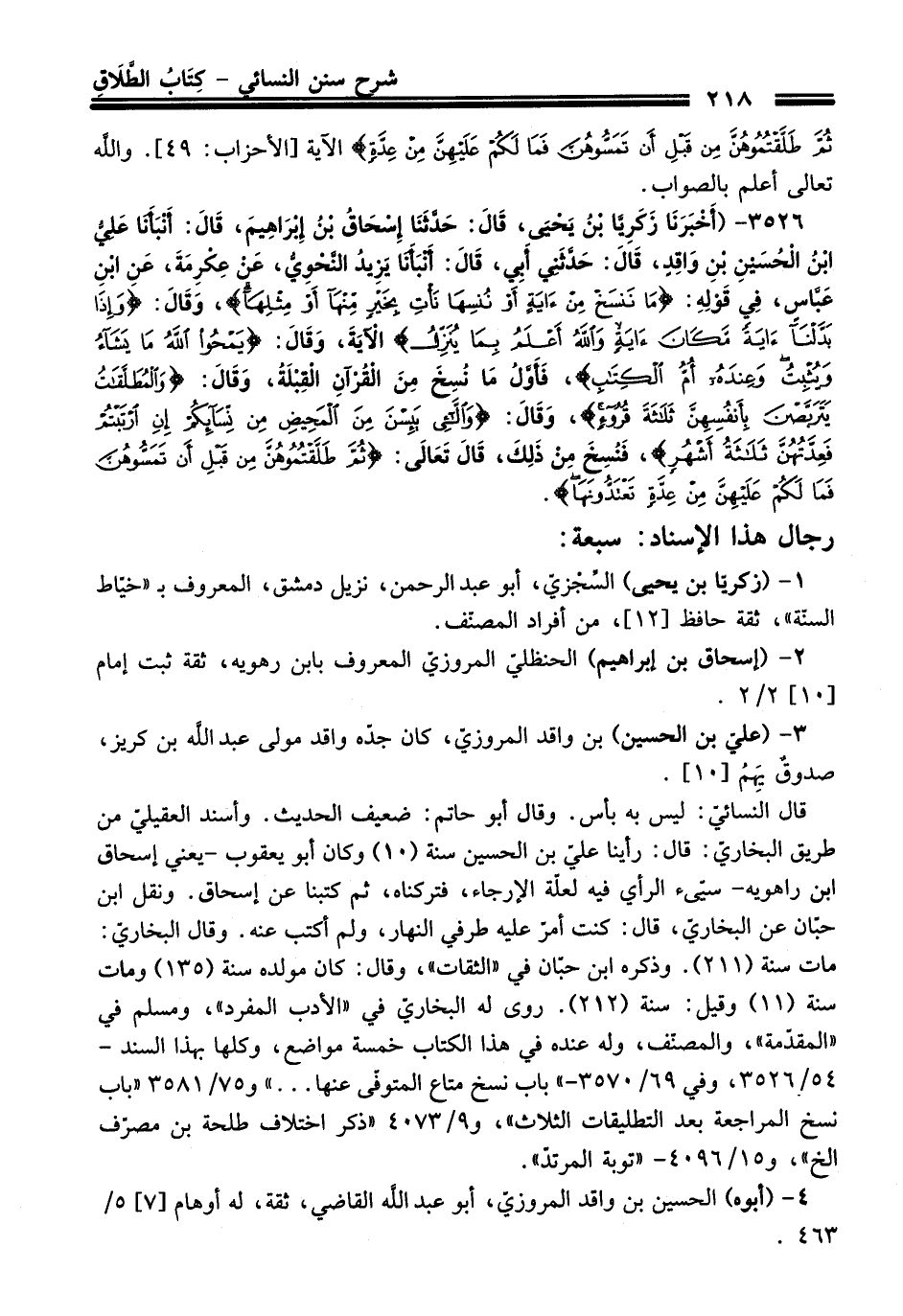 قال النسائيّ: ليس به بأس. وقال أبو حاتم: ضعيف الحديث. وأسند العقيليّ من طريق البخاريّ: قال: رأينا عليّ بن الحسين سنة (10) وكان أبو يعقوب -يعني إسحاق ابن راهويه- سيّىء الرأي فيه لعلّة الإرجاء، فتركناه، ثم كتبنا عن إسحاق. ونقل ابن حبّان عن البخاريّ، قال: كنت أمرّ عليه طرفىِ النهار، ولم أكتب عنه. وقال البخاريّ: مات سنة (211). وذكره ابن حبّان في "الثقات"، وقال: كان مولده سنة (135) ومات سنة (11) وقيل: سنة (212). روى له البخاريّ في "الأدب المفرد"، ومسلم في "المقدمة"، والمصنّف، وله عنده في هذا الكتاب خمسة مواضع، وكلها بهذا السند - 54/ 3526، وفي 69/ 3570 - " باب نسخ متاع المتوفّى عنها ... "و75/ 3581 "باب نسخ المراجعة بعد التطليقات الثلاث"، و 9/ 4073 "ذكر اختلاف طلحة بن مصرّف الخ"، و15/ 4096 - "توبة المرتدّ".