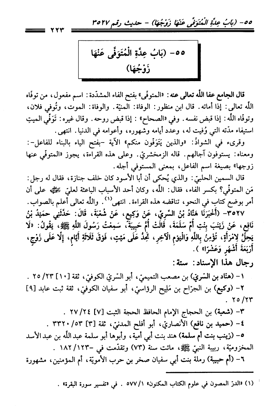 3527 - (أَخْبَرَنَا هَنَّادُ بْنُ السَّرِيِّ, عَنْ وَكِيعٍ, عَنْ شُعْبَةَ, قَالَ: حَدَّثَنِي حُمَيْدُ بْنُ نَافِعٍ, عَنْ زَيْنَبَ بِنْتِ أُمِّ سَلَمَةَ, قَالَتْ: أُمُّ حَبِيبَةَ, سَمِعْتُ رَسُولَ اللهِ - صلى اللَّه عليه وسلم -, يَقُولُ: «لاَ يَحِلُّ لاِمْرَأَةٍ, تُؤْمِنُ بِاللَّهِ وَالْيَوْمِ الآخِرِ, تَحِدُّ عَلَى مَيِّتٍ, فَوْقَ ثَلاَثَةِ أَيَّامٍ, إِلاَّ عَلَى زَوْجٍ, أَرْبَعَةَ أَشْهُرٍ وَعَشْرًا»).