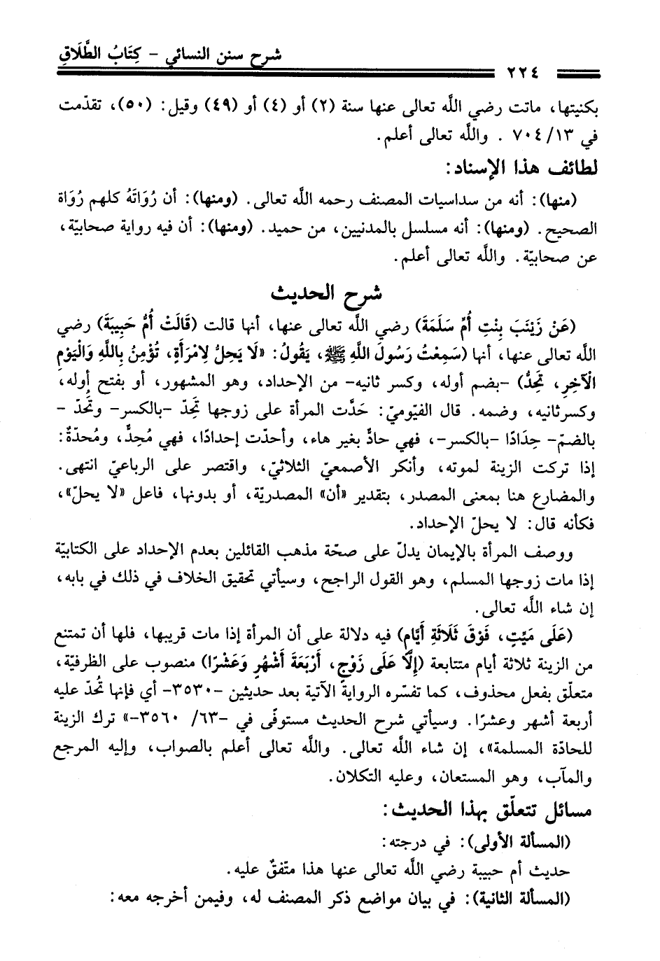 (عَلَى مَيِّتٍ، فَوْقَ ثَلَاَثةِ أَيَّامٍ) فيه دلالة على أن المرأة إذا مات قريبها، فلها أن تمتنع من الزينة ثلاثة أيام متتابعة (إِلاَّ عَلَى زَوْجٍ، أَرْبَعَةَ أَشْهُرٍ وَعَشْرًا) منصوب على الظرفيّة، متعلّق بفعل محذوف، كما تفسّره الرواية الآتية بعد حديثين -3530 - أي فإنها تُحدّ عليه أربعة أشهر وعشرًا. وسيأتي شرح الحديث مستوفًى في -63/ 3560 - " ترك الزينة للحادّة المسلمة"، إن شاء اللَّه تعالى. واللَّه تعالى أعلم بالصواب، وإليه المرجع والمآب، وهو المستعان، وعليه التكلان.