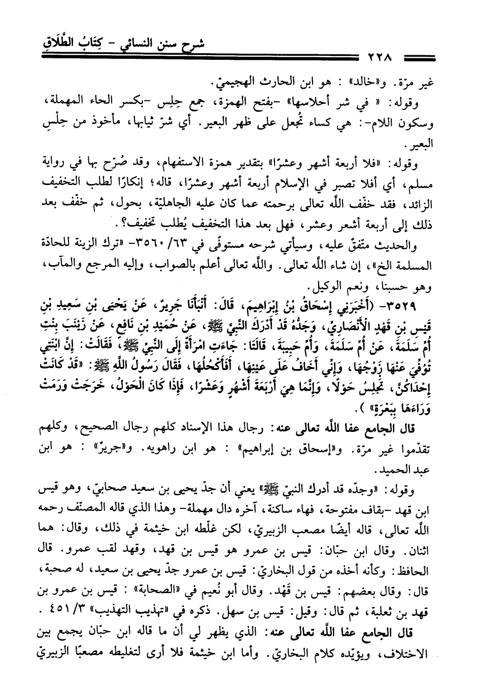 3529 - (أَخْبَرَنِي إِسْحَاقُ بْنُ إِبْرَاهِيمَ, قَالَ: أَنْبَأَنَا جَرِيرٌ, عَنْ يَحْيَى بْنِ سَعِيدِ بْنِ قَيْسِ بْنِ قَهْدٍ الأَنْصَارِيِّ, وَجَدُّهُ قَدْ أَدْرَكَ النَّبِيَّ - صلى اللَّه عليه وسلم -, عَنْ حُمَيْدِ بْنِ نَافِعٍ, عَنْ زَيْنَبَ بِنْتِ أُمِّ سَلَمَةَ, عَنْ أُمِّ سَلَمَةَ, وَأُمِّ حَبِيبَةَ, قَالَتَا: جَاءَتِ امْرَأَةٌ إِلَى النَّبِيِّ - صلى اللَّه عليه وسلم -, فَقَالَتْ: إِنَّ ابْنَتِي تُوُفِّيَ عَنْهَا زَوْجُهَا, وَإِنِّي أَخَافُ عَلَى عَيْنِهَا, أَفَأَكْحُلُهَا, فَقَالَ رَسُولُ اللهِ - صلى اللَّه عليه وسلم -: «قَدْ كَانَتْ إِحْدَاكُنَّ, تَجْلِسُ حَوْلاً, وَإِنَّمَا هِيَ أَرْبَعَةَ أَشْهُرٍ وَعَشْرًا, فَإِذَا كَانَ الْحَوْلُ, خَرَجَتْ وَرَمَتْ وَرَاءَهَا بِبَعْرَةٍ»).