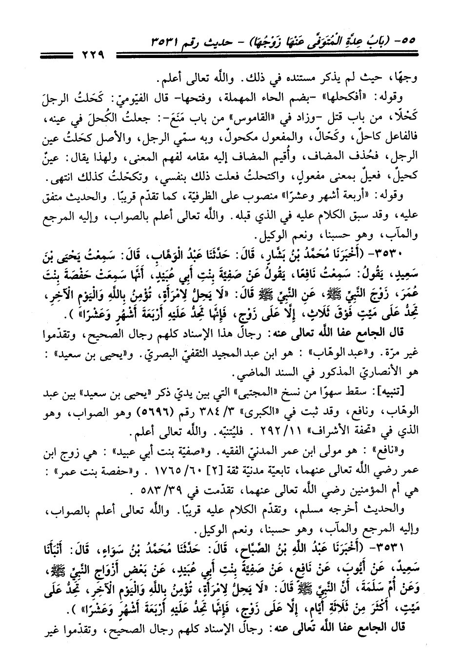 3530 - (أَخْبَرَنَا مُحَمَّدُ بْنُ بَشَّارٍ,, قَالَ: حَدَّثَنَا عَبْدُ الْوَهَّابِ, قَالَ: سَمِعْتُ يَحْيَى بْنَ سَعِيدٍ, يَقُولُ: سَمِعْتُ نَافِعًا, يَقُولُ عَنْ صَفِيَّةَ بِنْتِ أَبِي عُبَيْدٍ, أَنَّهَا سَمِعَتْ حَفْصَةَ بِنْتَ عُمَرَ, زَوْجَ النَّبِيِّ - صلى اللَّه عليه وسلم -, عَنِ النَّبِيِّ - صلى اللَّه عليه وسلم - قَالَ: «لاَ يَحِلُّ لاِمْرَأَةٍ, تُؤْمِنُ بِاللَّهِ وَالْيَوْمِ الآخِرِ, تَحِدُّ عَلَى مَيِّتٍ فَوْقَ ثَلاَثٍ, إِلاَّ عَلَى زَوْجٍ, فَإِنَّهَا تَحِدُّ عَلَيْهِ أَرْبَعَةَ أَشْهُرٍ وَعَشْرًا»).