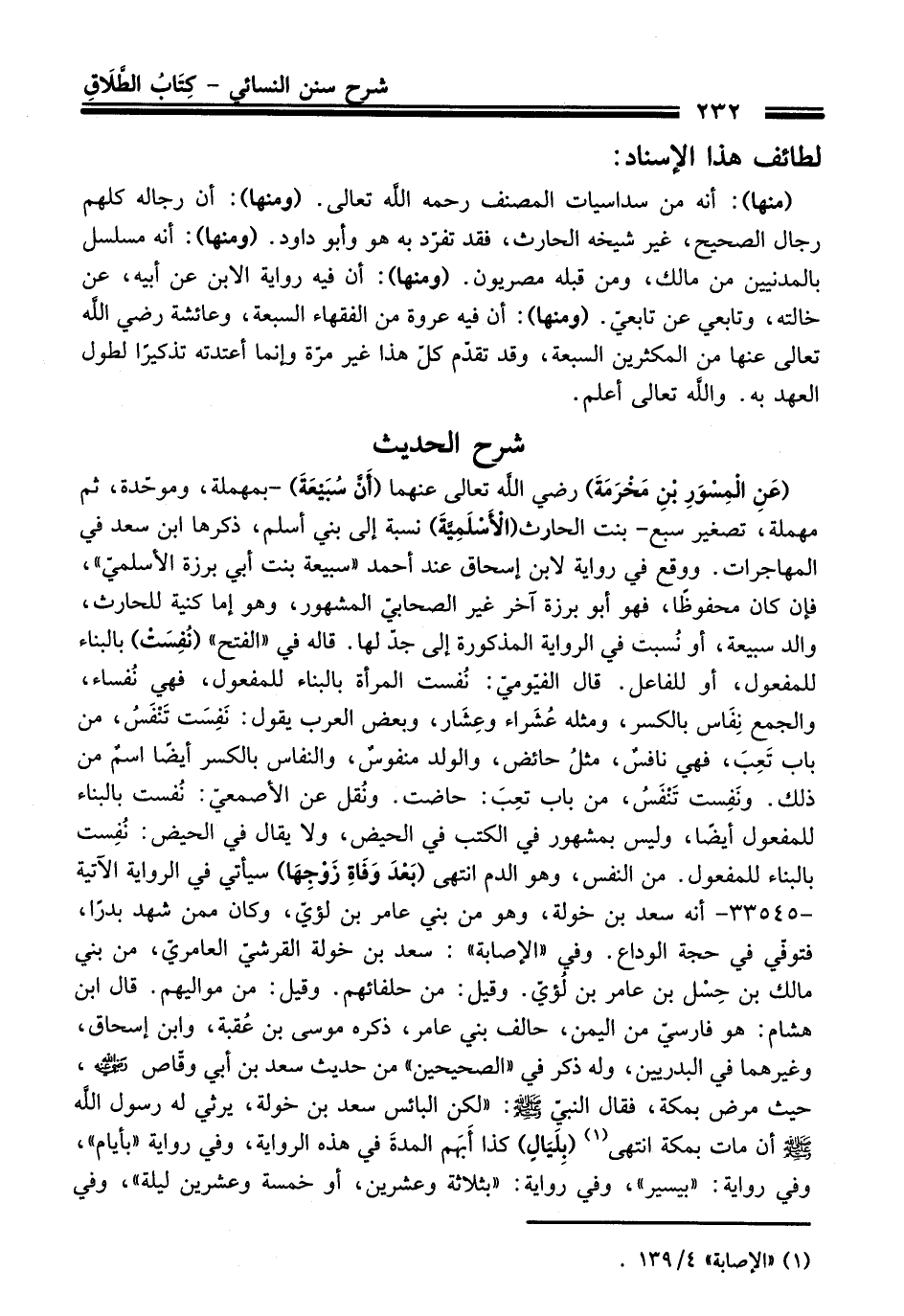 (عَنِ الْمِسْوَرِ بْنِ مَخْرَمَةَ) - رضي اللَّه تعالى عنهما - (أَنَّ سُبَيْعَةَ) -بمهملة، وموحّدة، ثم مهملة، تصغير سبع- بنت الحارث (الْأَسْلَمِيَّةَ) نسبة إلى بني أسلم، ذكرها ابن سعد في المهاجرات. ووقع في رواية لابن إسحاق عند أحمد "سبيعة بنت أبي برزة الأسلميّ"، فإن كان محفوظًا، فهو أبو برزة اخر غير الصحابيّ المشهور، وهو إما كنية للحارث، والد سبيعة، أو نُسبت في الرواية المذكورة إلى جدّ لها. قاله في "الفتح" (نُفِسَتْ) بالبناء للمفعول، أو للفاعل. قال الفيّوميّ: نُفست المرأة بالبناء للمفعول، فهي نُفساء، والجمع نِفَاس بالكسر، ومثله عُشَراء وعِشَار، وبعض العرب يقول: نَفِسَت تَنْفَسُ، من باب تَعِبَ، فهي نافسٌ، مثلُ حائض، والولد منفوسٌ، والنفاس بالكسر أيضًا اسمٌ من ذلك. ونَفِست تَنْفَسُ، من باب تعِبَ: حاضت. ونُقل عن الأصمعيّ: نُفست بالبناء للمفعول أيضًا، وليس بمشهور في الكتب في الحيض، ولا يقال في الحيض: نُفِست بالبناء للمفعول. من النفس، وهو الدم انتهى (بَعْدَ وَفَاةِ زَوْجِهَا) سيأتي في الرواية الآتية -33545 - أنه سعد بن خولة، وهو من بني عامر بن لؤيّ، وكان ممن شهد بدرًا، فتوفّي في حجة الوداع. وفي "الإصابة": سعد بن خولة القرشيّ العامريّ، من بني مالك بن حِسْل بن عامر بن لُؤيّ. وقيل: من حلفائهم. وقيل: من مواليهم. قال ابن هشام: هو فارسيّ من اليمن، حالف بني عامر، ذكره موسى بن عُقبة، وابن إسحاق، وغيرهما في البدريين، وله ذكر في "الصحيحين" من حديث سعد بن أبي وقّاص - رضي اللَّه عنه -، حيث مرض بمكة، فقال النبيّ - صلى اللَّه عليه وسلم -: "لكن البائس سعد بن خولة، يرثي له رسول اللَّه - صلى اللَّه عليه وسلم - أن مات بمكة انتهى (¬1) (بِلَيَالٍ) كذا أَبَهم المدةَ في هذه الرواية" وفي رواية "بأيام"، وفي رواية: "بيسير"، وفي رواية: "بثلاثة وعشرين، أو خمسة وعشرين ليلة"، وفي