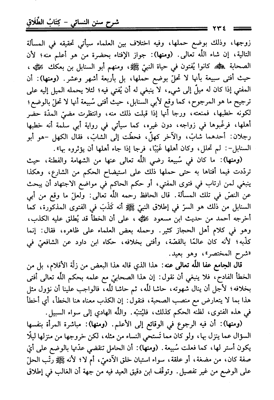 زوجها، وذلك بوضع حملها، وفيه اختلاف بين العلماء سيأتي تحقيقه في المسألة التالية، إن شاء اللَّه تعالى. (ومنها): جواز الإفتاء بحضرة من هو أعلم منه؛ لأن الصحابة - رضي اللَّه عنه - كانوا يُفتون في حياة النبيّ - صلى اللَّه عليه وسلم -، ومنهم أبو السنابل بن بعكك - رضي اللَّه عنه -، حيث أفتى سبيعة بأنها لا تحلّ بوضع حملها، بل بأربعة أشهر وعشر. (ومنها): أن المفتي إذا كان له ميلٌ إلى شيء، لا ينبغي له أن يُفتي فيه؛ لئلا يحمله الميل إليه على ترجيح ما هو المرجوح، كما وقع لأبي السنابل، حيث أفتى سُبيعة أنها لا تحلّ بالوضع؛ لكونه خطبها، فمنعته، ورجا أنها إذا قبلت ذلك منه، وانتظرت مضيّ المدّة حضر أهلها، فرغّبوها في زواجه، دون غيره، كما سيأتي في رواية أبي سلمة أنه خطبها رجلان: أحدهما شابّ، والآخر كهل، فحطّت إلى الشابّ، فقال الكهل -هو أبو السنابل-: لم تحلل، وكان أهلها غَيَبًا، فرجا إذا جاء أهلها أن يؤثروه بها".