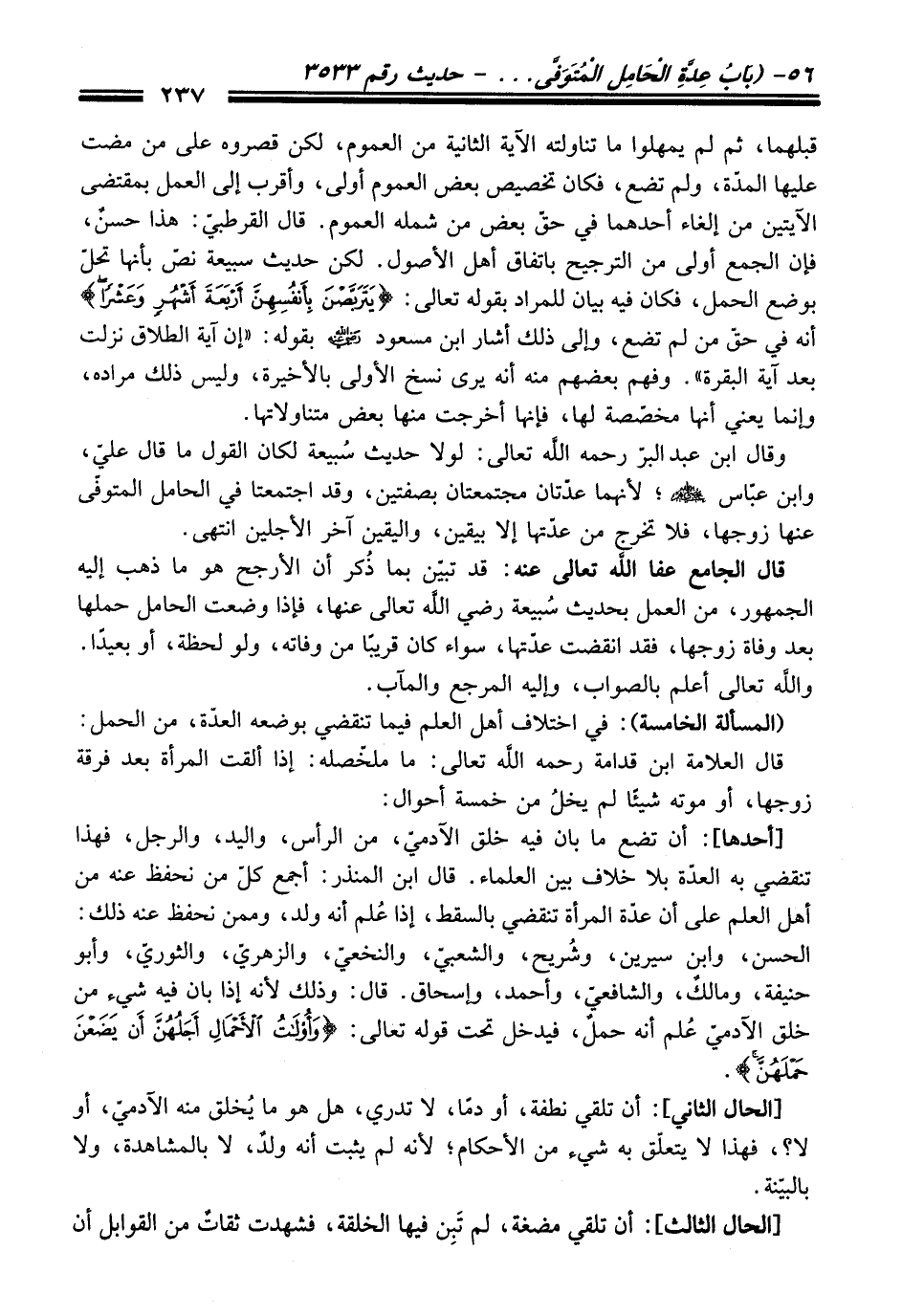 وقال ابن عبد البرّ -رحمه اللَّه تعالى-: لولا حديث سُبيعة لكان القول ما قال عليّ، وابن عبّاس - رضي الله عنهم -؛ لأنهما عدّتان مجتمعتان بصفتين، وقد اجتمعتا في الحامل المتوفّى عنها زوجها، فلا تخرج من عدّتها إلا بيقين، واليقين آخر الأجلين انتهى.