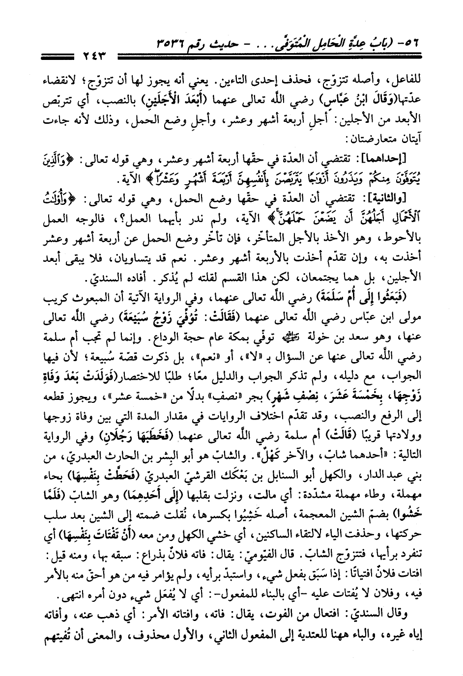 [والثانية]: تقتضي أن العدّة في حقّها وضع الحمل، وهي قوله تعالى: {وَأُولَاتُ الْأَحْمَالِ أَجَلُهُنَّ أَنْ يَضَعْنَ حَمْلَهُنَّ} الآية، ولم ندر بأيهما العمل؟، فالوجه العمل بالأحوط، وهو الأخذ بالأجل المتأخّر، فإن تأخّر وضع الحمل عن أربعة أشهر وعشر أخذت به، وإن تقدّم أخذت بالأربعة أشهر وعشر. نعم قد يتساويان، فلا يبقى أبعد الأجلين، بل هما يجتمعان، لكن هذا القسم لقلته لم يُذكر. أفاده السنديّ.