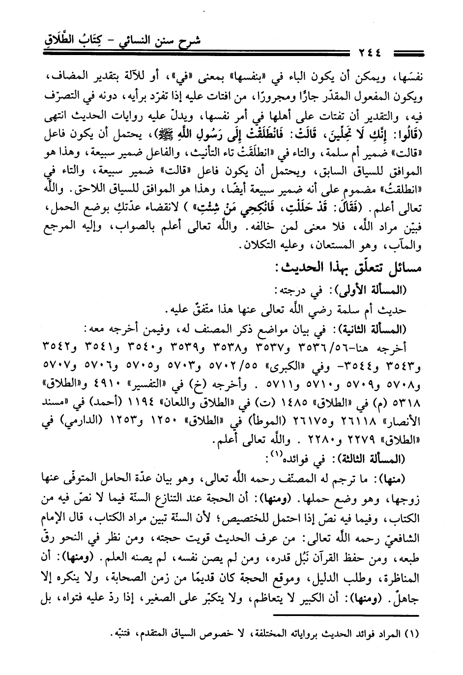 (منها): ما ترجم له المصنّف -رحمه اللَّه تعالى-، وهو بيان عدّة الحامل المتوفّى عنها زوجها، وهو وضع حملها. (ومنها): أن الحجة عند التنازع السنّة فيما لا نصّ فيه من الكتاب، وفيما فيه نصّ إذا احتمل للختصيص؛ لأن السنّة تبين مراد الكتاب، قال الإمام الشافعيّ -رحمه اللَّه تعالى-: من عرف الحديث قويت حجته، ومن نظر في النحو رقّ طبعه، ومن حفظ القرآن نَبُل قدره، ومن لم يصن نفسه، لم يصنه العلم. (ومنها): أن المناظرة، وطلب الدليل، وموقع الحجة كان قديمًا من زمن الصحابة، ولا ينكره إلا جاهلٌ. (ومنها): أن الكبير لا يتعاظم، ولا يتكبّر على الصغير، إذا ردّ عليه فتواه، بل