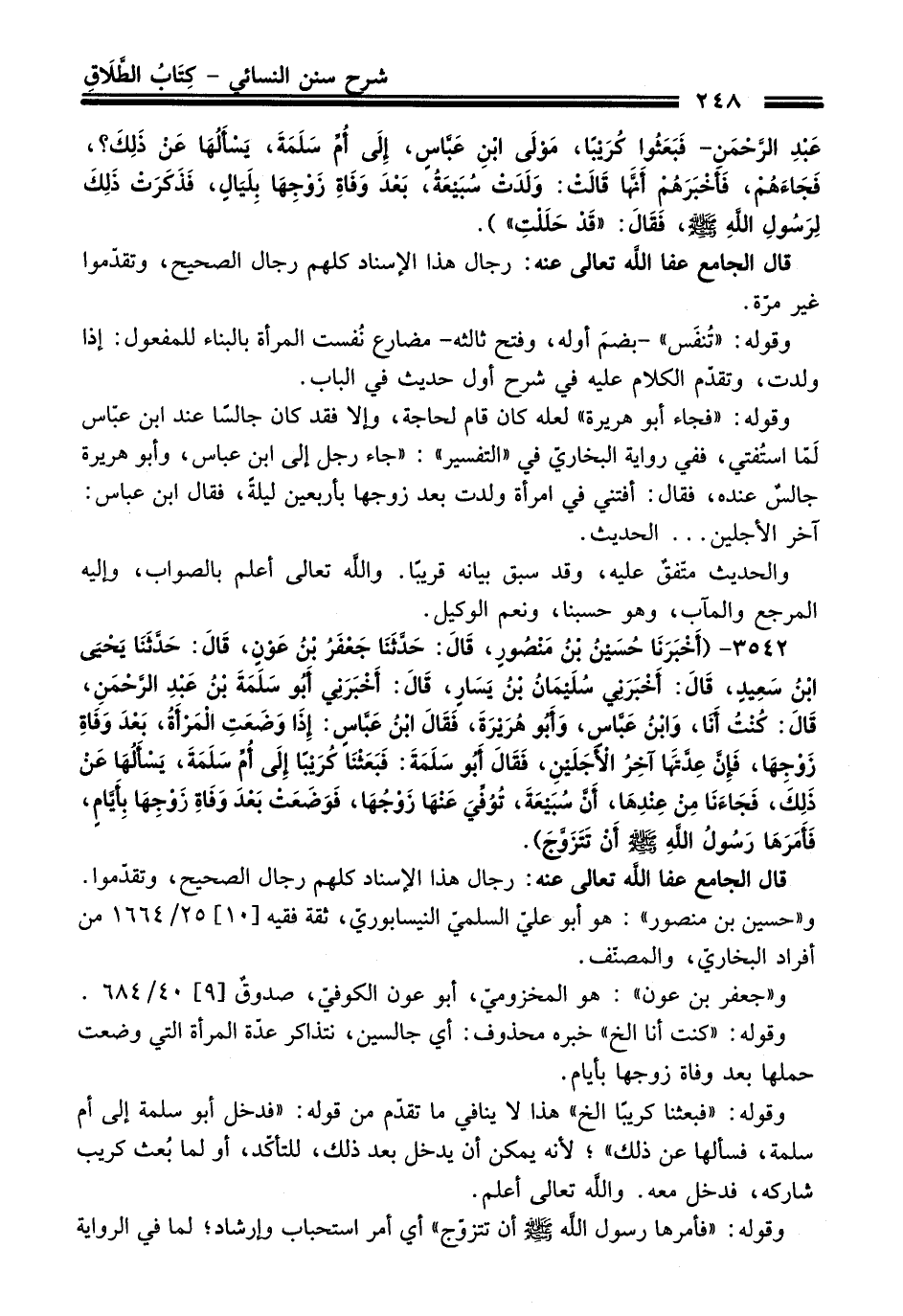 3542 - (أَخْبَرَنَا حُسَيْنُ بْنُ مَنْصُورٍ, قَالَ: حَدَّثَنَا جَعْفَرُ بْنُ عَوْنٍ, قَالَ: حَدَّثَنَا يَحْيَى بْنُ سَعِيدٍ, قَالَ: أَخْبَرَنِي سُلَيْمَانُ بْنُ يَسَارٍ, قَالَ: أَخْبَرَنِي أَبُو سَلَمَةَ بْنُ عَبْدِ الرَّحْمَنِ, قَالَ: كُنْتُ أَنَا, وَابْنُ عَبَّاسٍ, وَأَبُو هُرَيْرَةَ, فَقَالَ ابْنُ عَبَّاسٍ: إِذَا وَضَعَتِ الْمَرْأَةُ, بَعْدَ وَفَاةِ زَوْجِهَا, فَإِنَّ عِدَّتَهَا آخِرُ الأَجَلَيْنِ, فَقَالَ أَبُو سَلَمَةَ: فَبَعَثْنَا كُرَيْبًا إِلَى أُمِّ سَلَمَةَ, يَسْأَلُهَا عَنْ ذَلِكَ, فَجَاءَنَا مِنْ عِنْدِهَا, أَنَّ سُبَيْعَةَ, تُوُفِّيَ عَنْهَا زَوْجُهَا, فَوَضَعَتْ بَعْدَ وَفَاةِ زَوْجِهَا بِأَيَّامٍ, فَأَمَرَهَا رَسُولُ اللهِ - صلى اللَّه عليه وسلم - أَنْ تَتَزَوَّجَ).