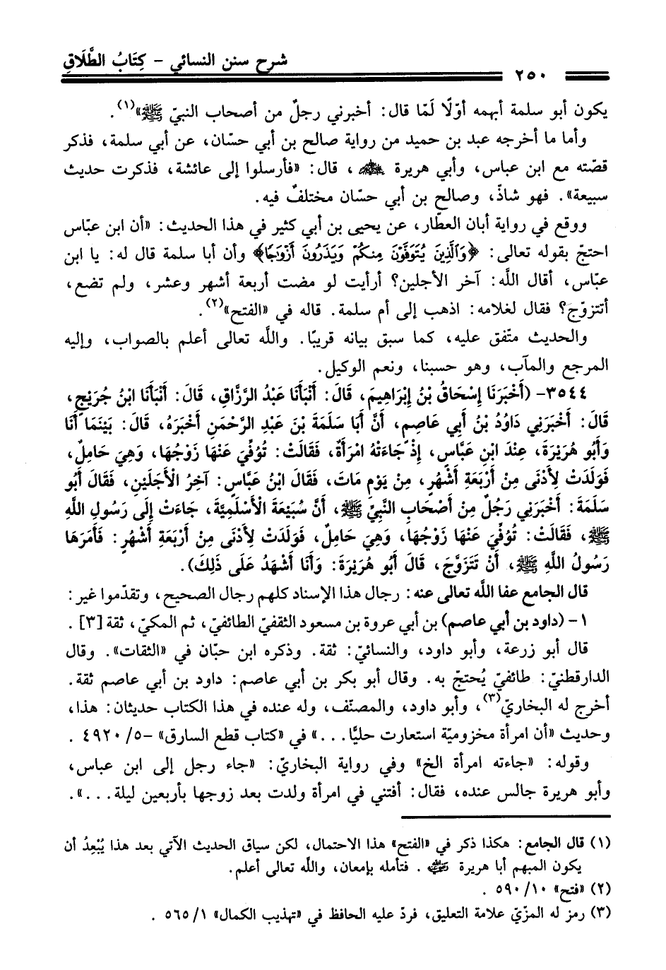 3544 - (أَخْبَرَنَا إِسْحَاقُ بْنُ إِبْرَاهِيمَ, قَالَ: أَنْبَأَنَا عَبْدُ الرَّزَّاقِ, قَالَ: أَنْبَأَنَا ابْنُ جُرَيْجٍ, قَالَ: أَخْبَرَنِي دَاوُدُ بْنُ أَبِي عَاصِمٍ, أَنَّ أَبَا سَلَمَةَ بْنَ عَبْدِ الرَّحْمَنِ أَخْبَرَهُ, قَالَ: بَيْنَمَا أَنَا وَأَبُو هُرَيْرَةَ, عِنْدَ ابْنِ عَبَّاسٍ, إِذْ جَاءَتْهُ امْرَأَةٌ, فَقَالَتْ: تُوُفِّيَ عَنْهَا زَوْجُهَا, وَهِى حَامِلٌ, فَوَلَدَتْ لأَدْنَى مِنْ أَرْبَعَةِ أَشْهُرٍ, مِنْ يَوْمِ مَاتَ, فَقَالَ ابْنُ عَبَّاسٍ: آخِرُ الأَجَلَيْنِ, فَقَالَ أَبُو سَلَمَةَ: أَخْبَرَنِي رَجُلٌ مِنْ أَصْحَابِ النَّبِيِّ - صلى اللَّه عليه وسلم -, أَنَّ سُبَيْعَةَ الأَسْلَمِيَّةَ, جَاءَتْ إِلَى رَسُولِ اللهِ - صلى اللَّه عليه وسلم -, فَقَالَتْ: تُوُفِّيَ عَنْهَا زَوْجُهَا, وَهِيَ حَامِلٌ, فَوَلَدَتْ لأَدْنَى مِنْ أَرْبَعَةِ أَشْهُرٍ: فَأَمَرَهَا رَسُولُ اللهِ - صلى اللَّه عليه وسلم -, أَنْ تَتَزَوَّجَ, قَالَ أَبُو هُرَيْرَةَ: وَأَنَا أَشْهَدُ عَلَى ذَلِكَ).