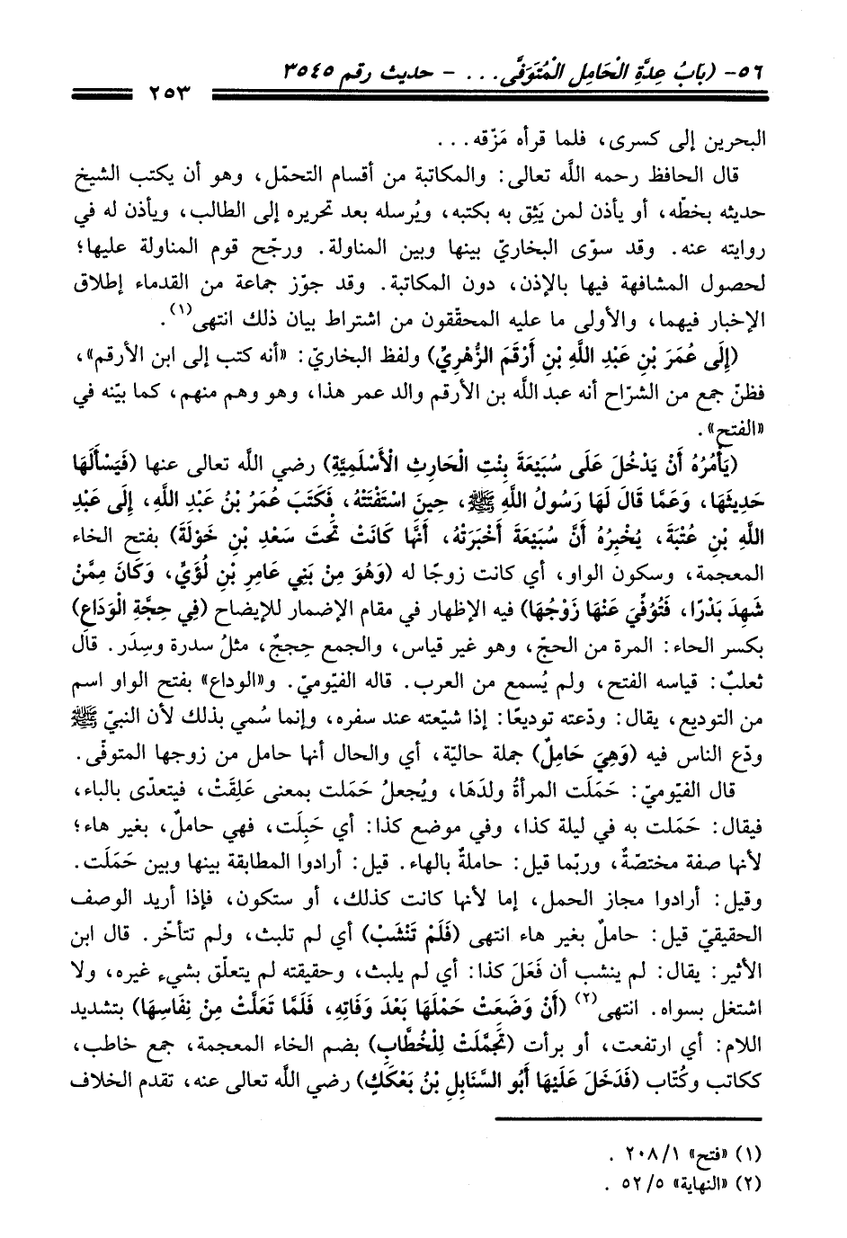 (يَأْمُرُهُ أَنْ يَدْخُلَ عَلَى سُبَيعَةَ بنْتِ الْحَارِثِ الأَسْلَمِيّةِ) - رضي اللَّه تعالى عنها - (فَيَسْأَلَهَا حَدِيثَهَا، وَعَمَّا قَالَ لَهَا رَسُولُ اللَّهِ - صلى اللَّه عليه وسلم -، حِينَ اسْتَفْتَتْهُ، فَكَتَبَ عُمَرُ بْنُ عَبْدِ اللَّه، إِلَى عَبدِ اللَّهِ بْنِ عُتْبَةَ، يُخْبِرُهُ أَنَّ سُبَيعَةَ أَخْبَرَتْهُ، أَنَّهَا كَانَتْ تَحْتَ سَعْدِ بْنِ خَوْلَةَ) بفتح الخاء المعجمة، وسكون الواو، أي كانت زوجًا له (وَهُوَ مِنْ بَنِي عَامِرِ بْنِ لُؤَيِّ، وَكَانَ مِمَّنْ شَهِدَ بَدْرًا، فَتُوُفِّيَ عَنْهَا زَوْجُهَا) فيه الإظهار في مقام الإضمار للإيضاح (فِي حِجَّةِ الْوَدَاعِ) بكسر الحاء: المرة من الحجّ، وهو غير قياس، والجمع حِججٌ، مثلُ سدرة وسِدَر. قال ثعلبٌ: قياسه الفتح، ولم يُسمع من العرب. قاله الفيّوميّ. و"الوداع" بفتح الواو اسم من التوديع، يقال: ودّعته توديعًا: إذا شيّعته عند سفره، وإنما سُمي بذلك لأن النبيّ - صلى اللَّه عليه وسلم - ودّع الناس فيه (وَهِيَ حَامِلٌ) جملة حاليّة، أي والحال أنها حامل من زوجها المتوفّى.