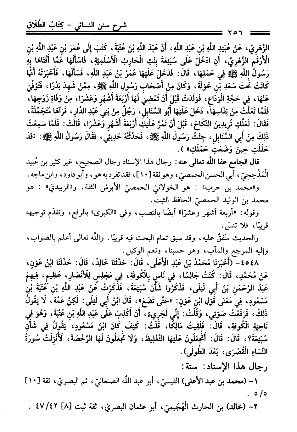 3548 - (أَخْبَرَنَا مُحَمَّدُ بْنُ عَبْدِ الأَعْلَى, قَالَ: حَدَّثَنَا خَالِدٌ, قَالَ: حَدَّثَنَا ابْنُ عَوْنٍ, عَنْ مُحَمَّدٍ, قَالَ: كُنْتُ جَالِسًا فِي نَاسٍ بِالْكُوفَةِ, فِي مَجْلِسٍ لِلأَنْصَارِ, عَظِيمٍ, فِيهِمْ عَبْدُ الرَّحْمَنِ بْنُ أَبِي لَيْلَى, فَذَكَرُوا شَأْنَ سُبَيْعَةَ, فَذَكَرْتُ عَنْ عَبْدِ اللَّهِ بْنِ عُتْبَةَ بْنِ مَسْعُودٍ, فِي مَعْنَى قَوْلِ ابْنِ عَوْنٍ: "حَتَّى تَضَعَ", قَالَ ابْنُ أَبِي لَيْلَى: لَكِنَّ عَمَّهُ, لاَ يَقُولُ ذَلِكَ, فَرَفَعْتُ صَوْتِي, وَقُلْتُ: إِنِّي لَجَرِيءٌ, أَنْ أَكْذِبَ عَلَى عَبْدِ اللَّهِ بْنِ عُتْبَةَ, وَهُوَ فِي نَاحِيَةِ الْكُوفَةِ, قَالَ: فَلَقِيتُ مَالِكًا, قُلْتُ: كَيْفَ كَانَ ابْنُ مَسْعُودٍ, يَقُولُ فِي شَأْنِ سُبَيْعَةَ؟ , قَالَ: قَالَ: أَتَجْعَلُونَ عَلَيْهَا التَّغْلِيظَ, وَلاَ تَجْعَلُونَ لَهَا الرُّخْصَةَ, لأُنْزِلَتْ سُورَةُ النِّسَاءِ الْقُصْرَى, بَعْدَ الطُّولَى).